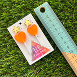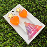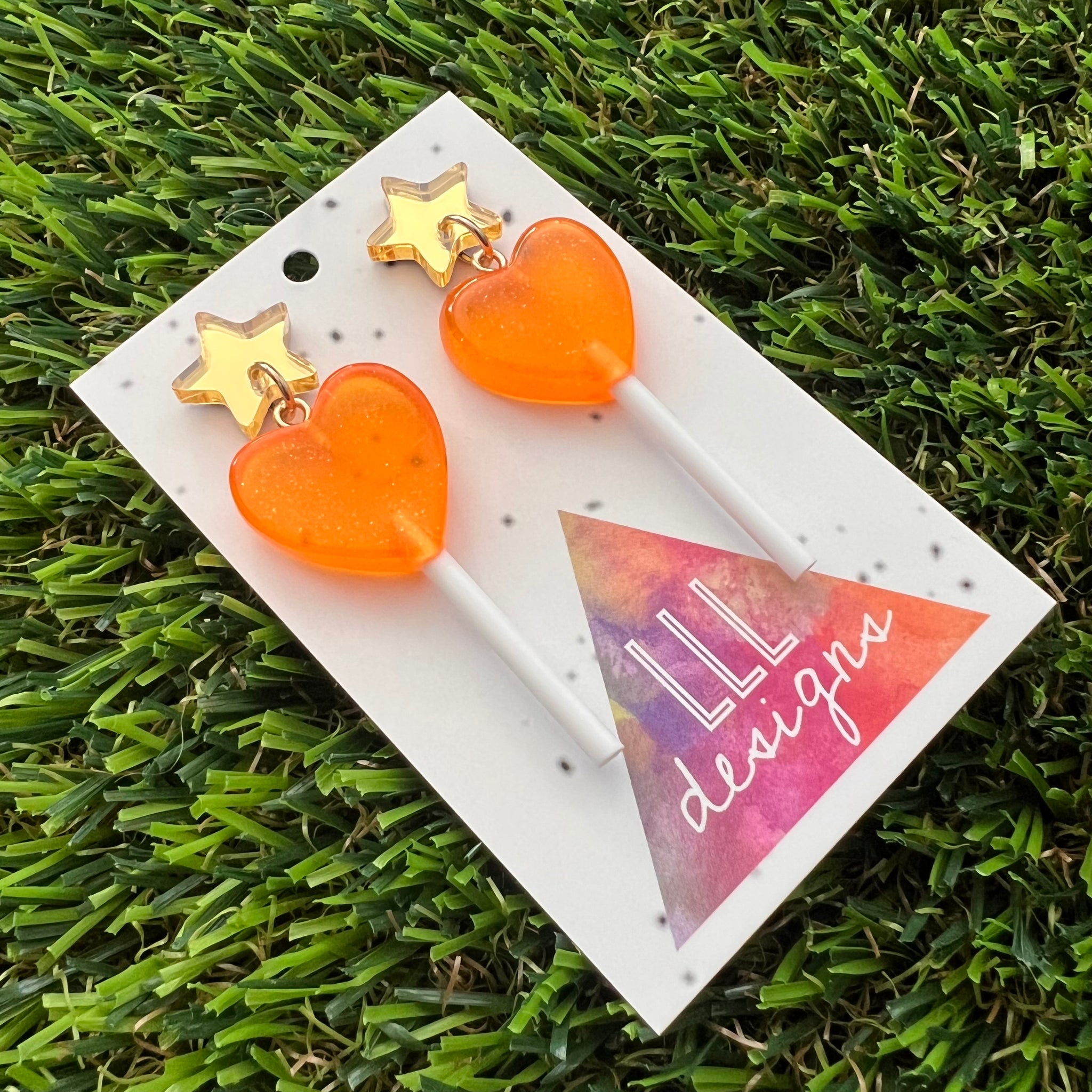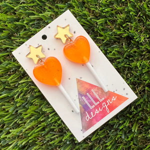 Orange Heart Lollipop Dangle Earrings Featuring Gold Mirror Star Top!