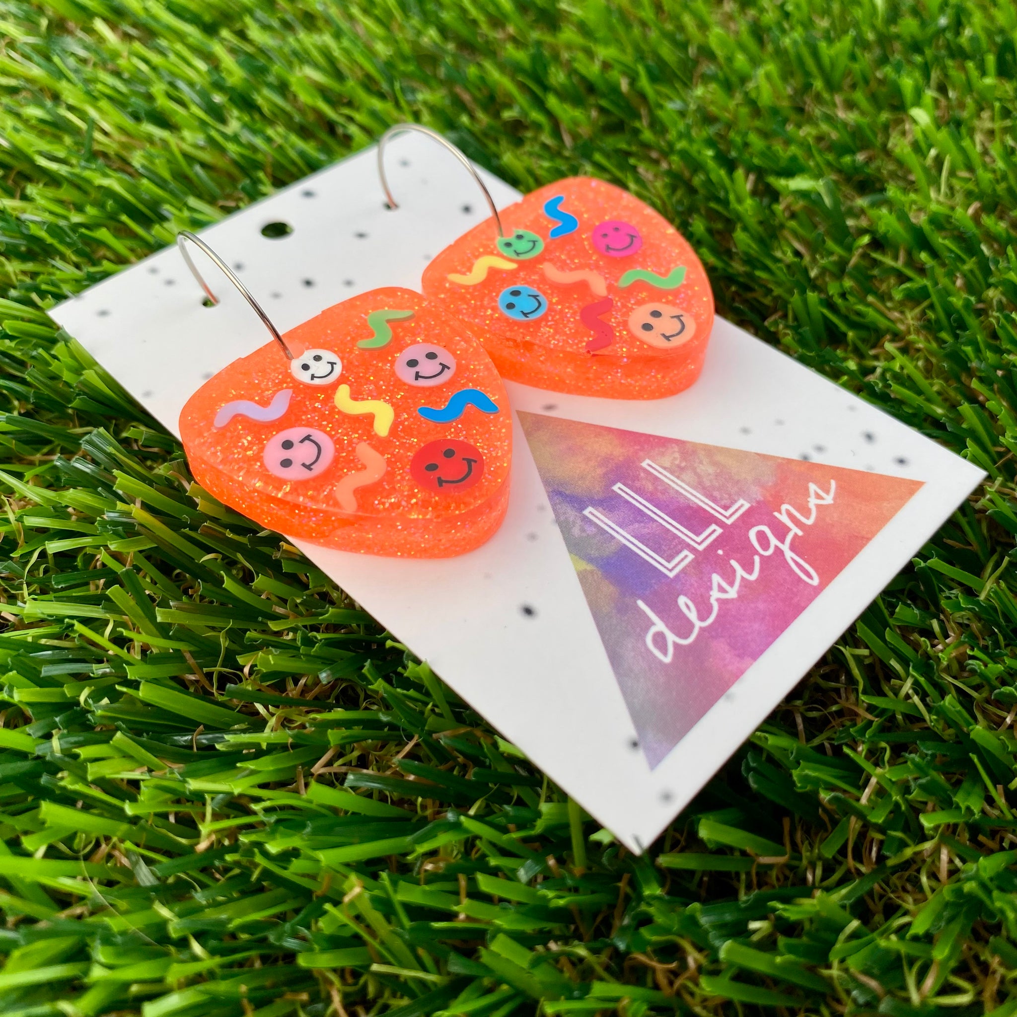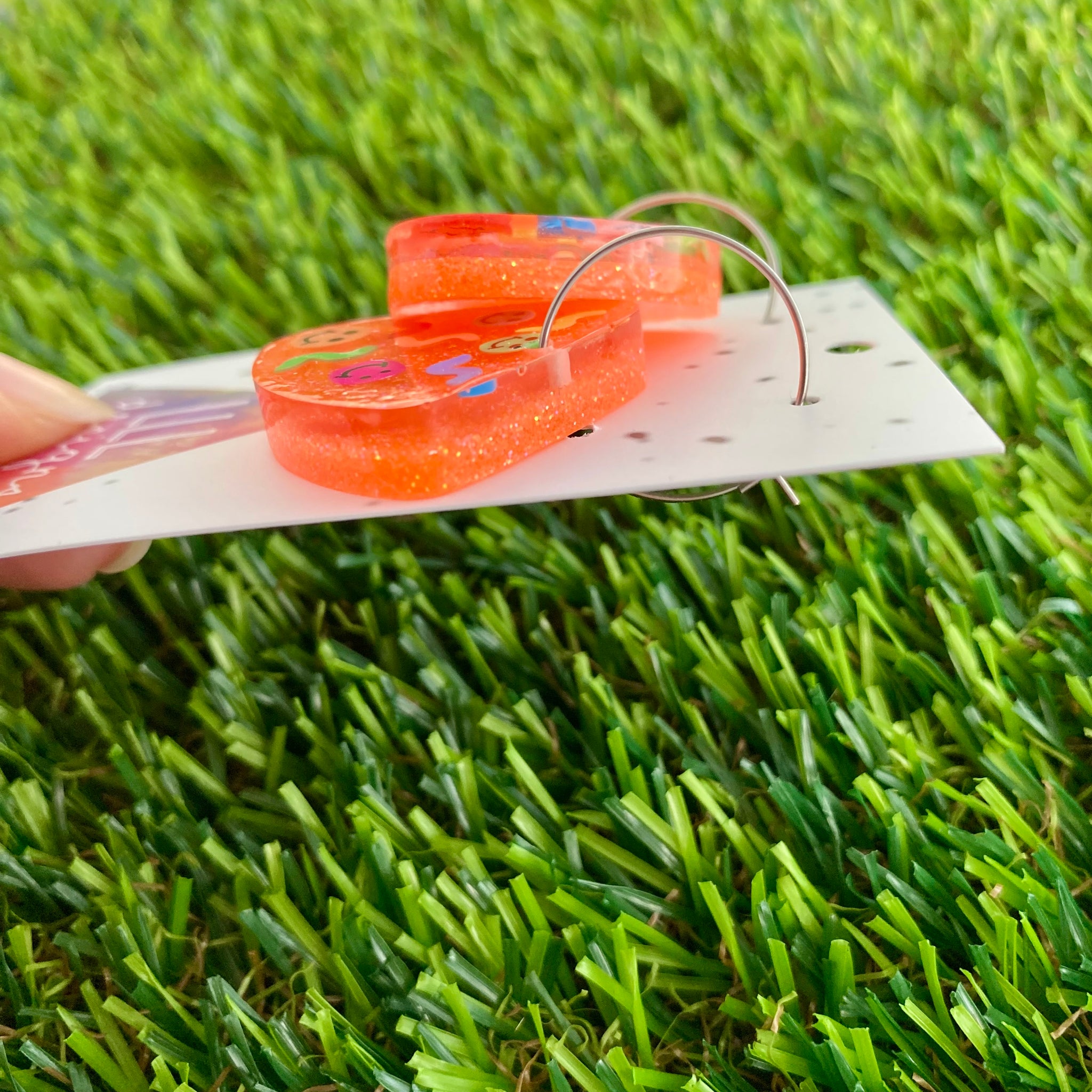 Resin Earrings - Glitter Neon Orange Guitar Pick Hoops Featuring Hand Placed Rainbow Smiley Faces and Squiggles!