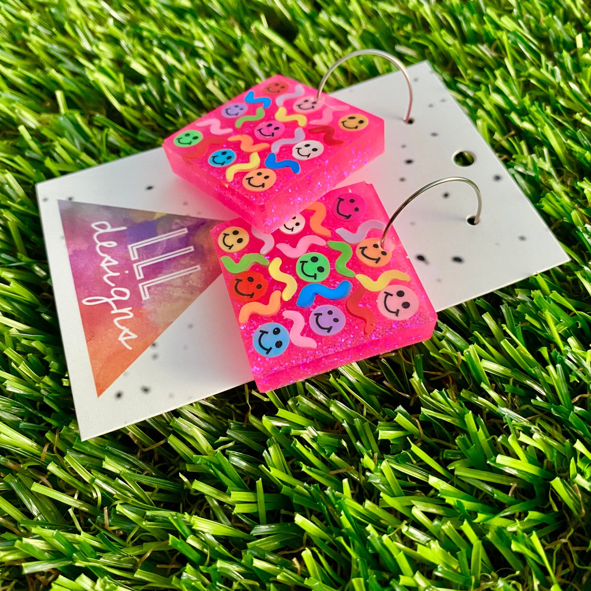 Resin Earrings - Glitter Neon Pink Square Hoops Featuring Hand Placed Rainbow Smiley Faces and Squiggles!