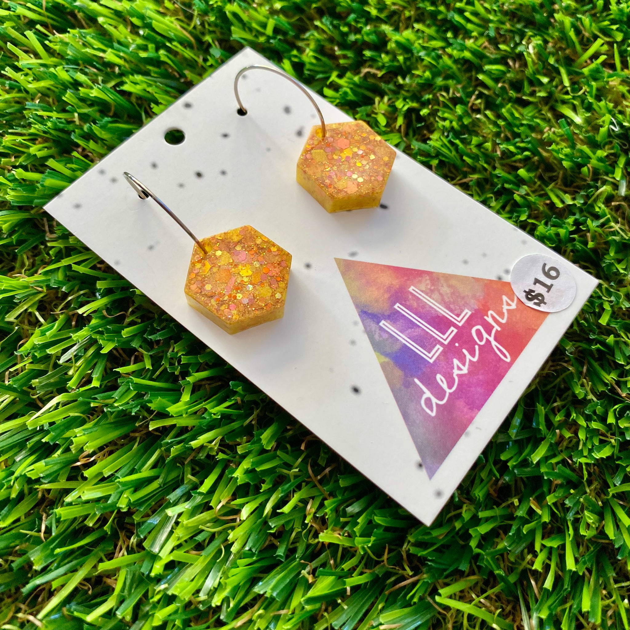 Resin Earrings - Gold Multi Glitter Hexagons Featuring Silver Hoops!