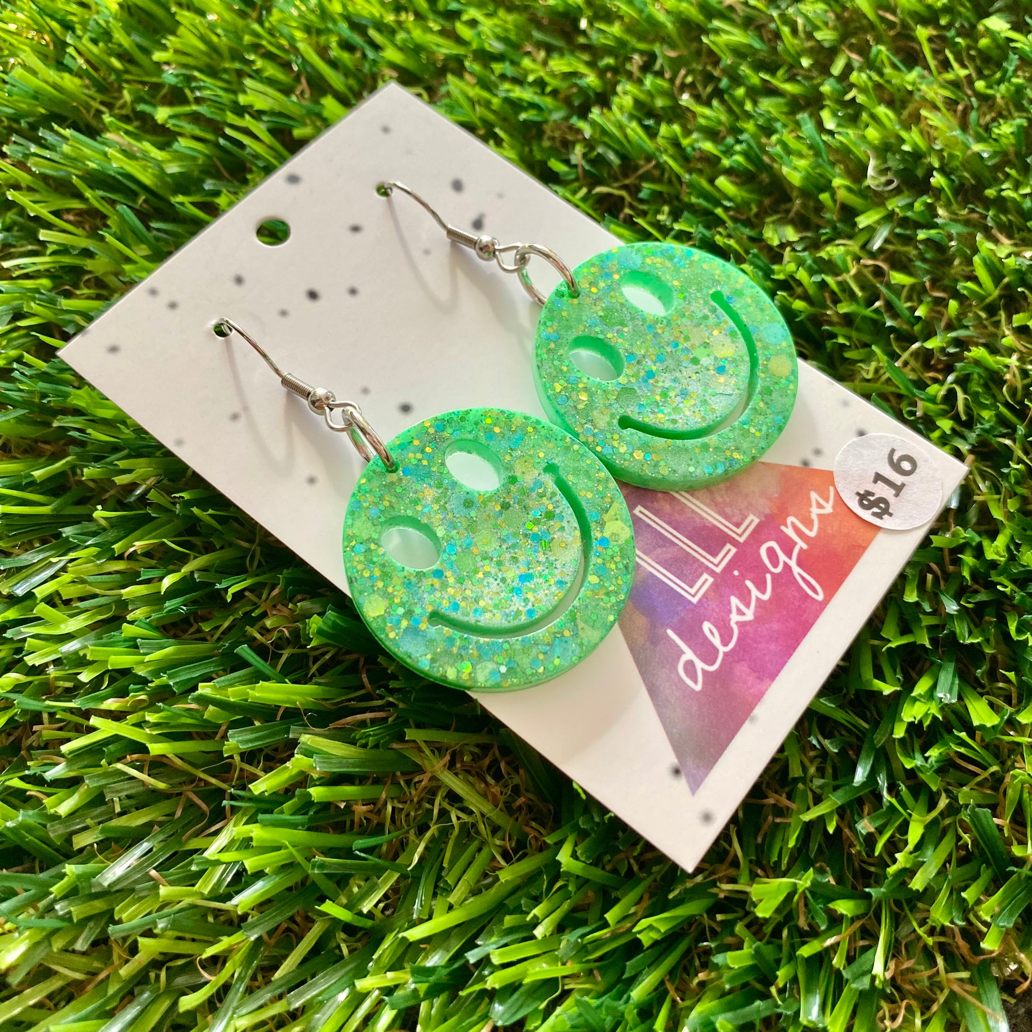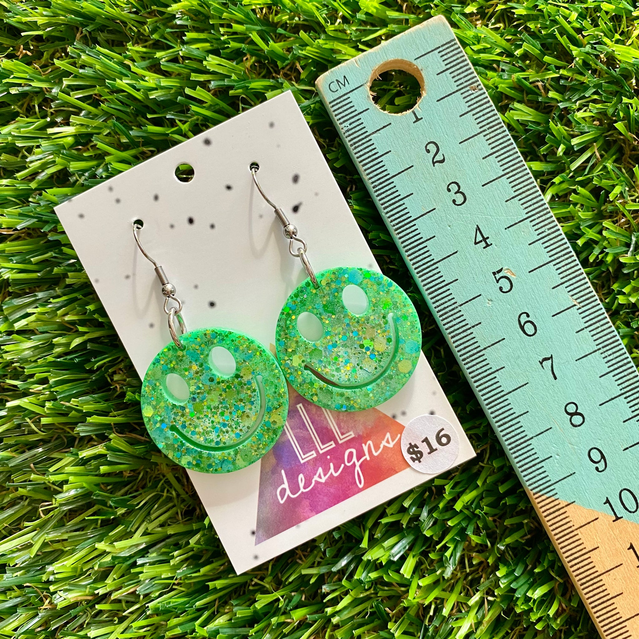 Resin Earrings - Green and Blue Confetti Smiley Faces Featuring a Hook Top!
