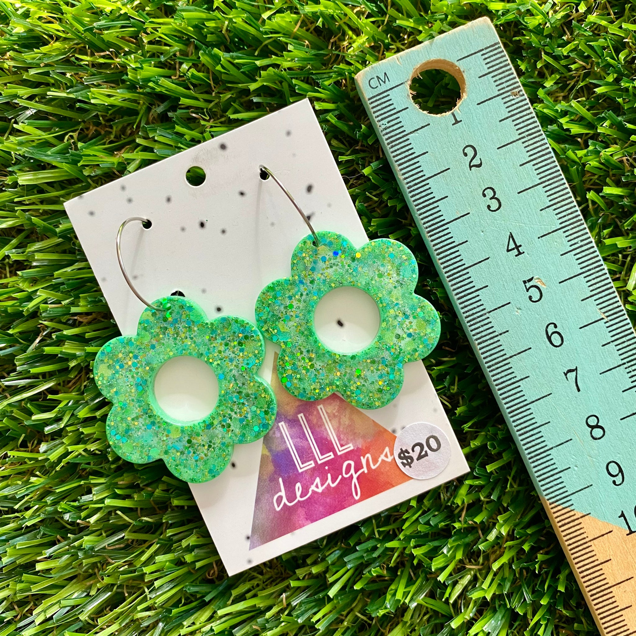 Resin Earrings - Green Multi Glitter Daisies Featuring a Silver Hoop!