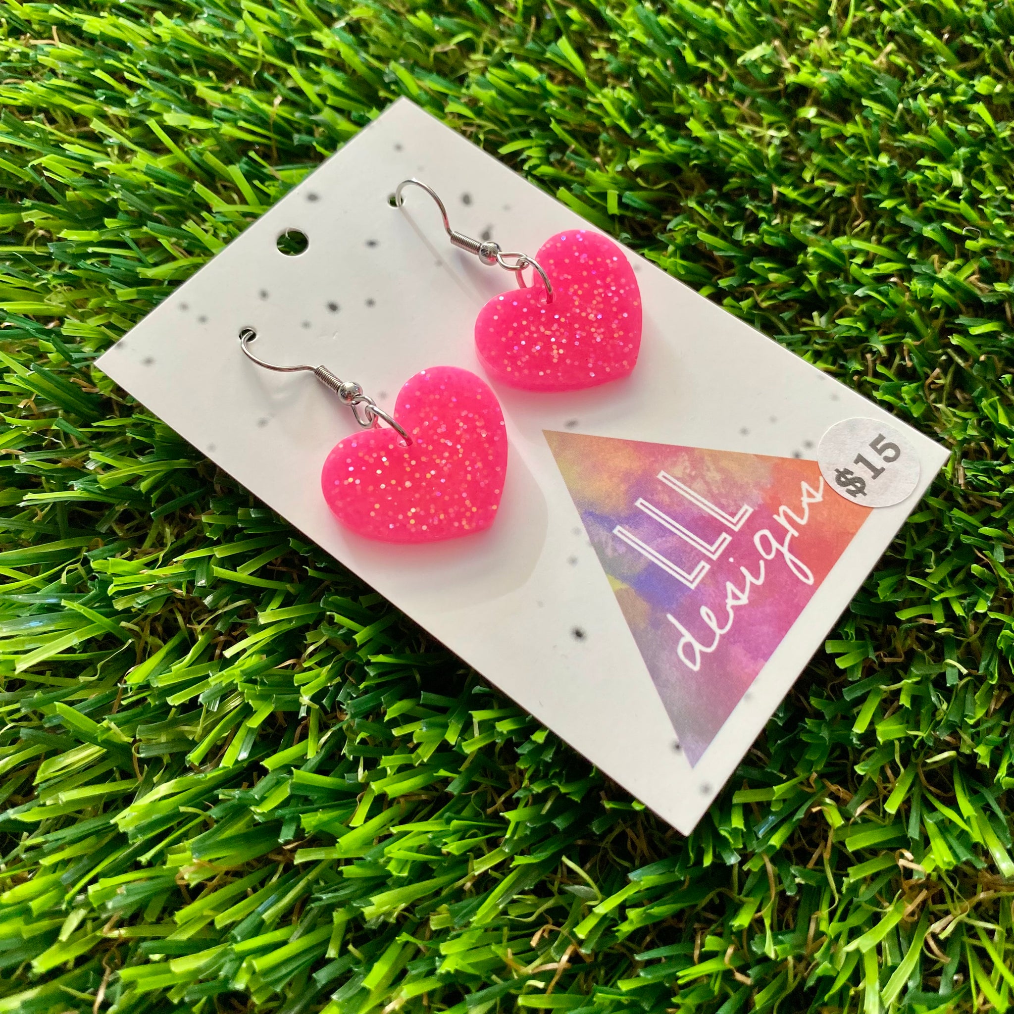 Resin Earrings - Neon Pink Glitter Hearts Featuring a Hook Top!