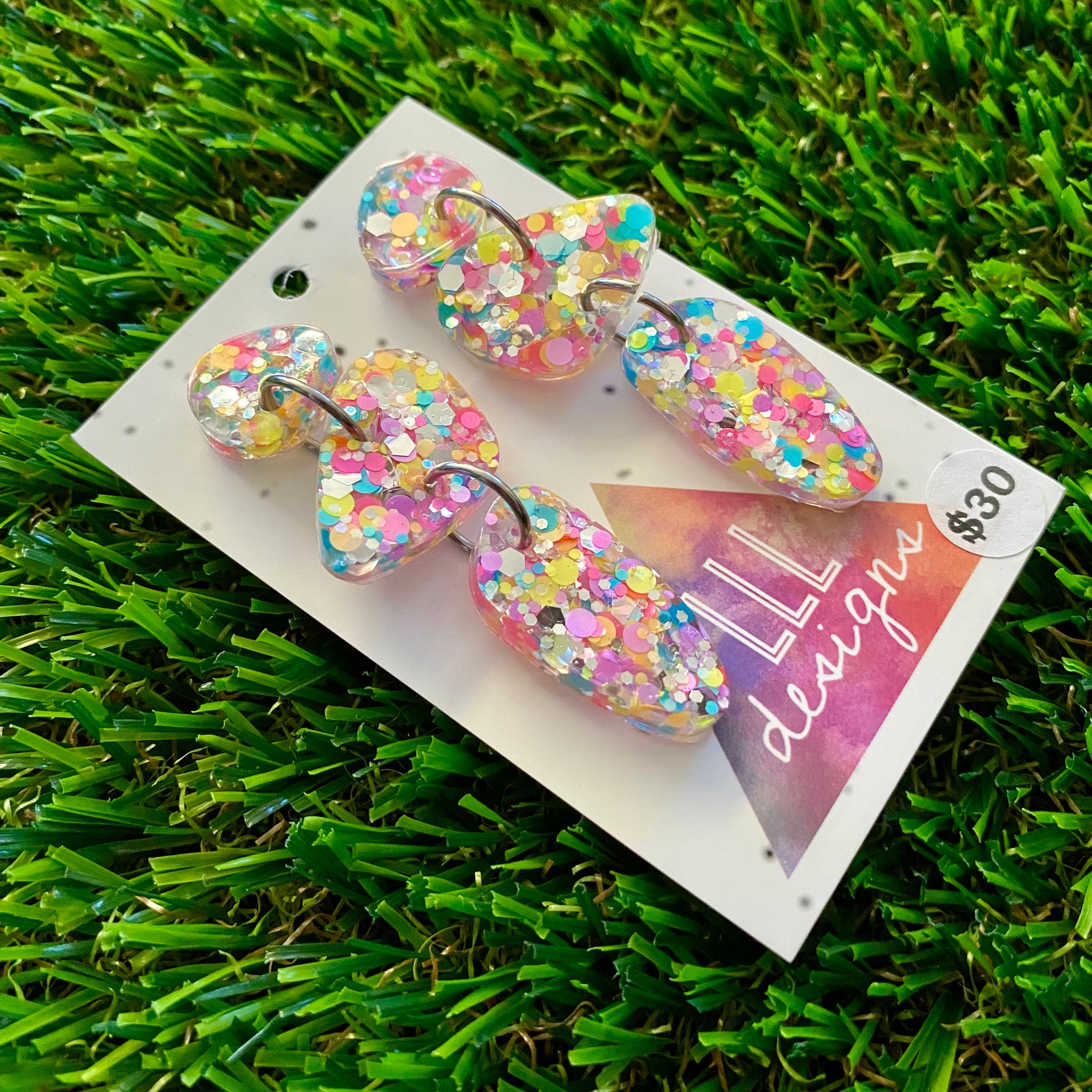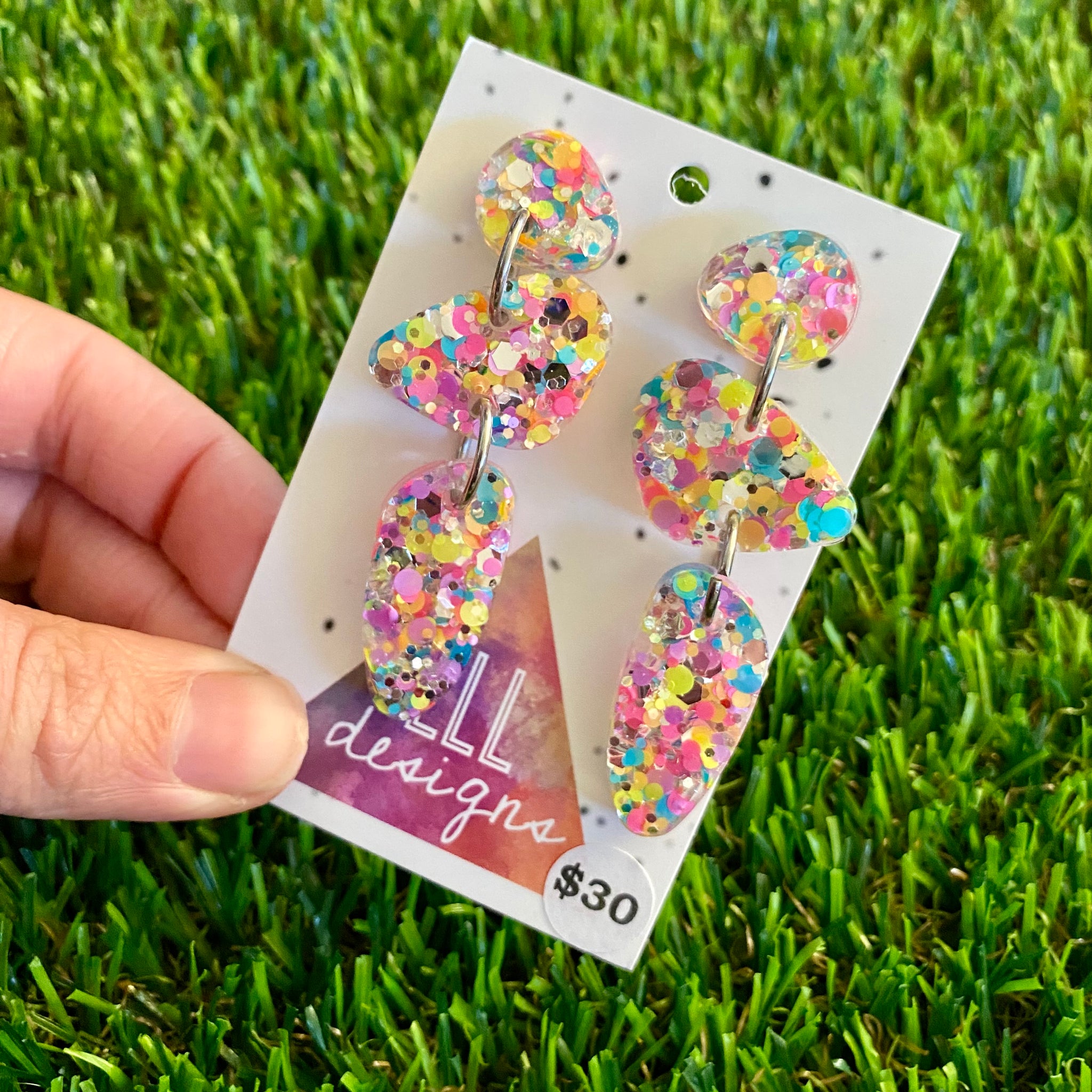 Resin Earrings - Silver Rainbow Confetti Pebble Dangles - Dino Design!