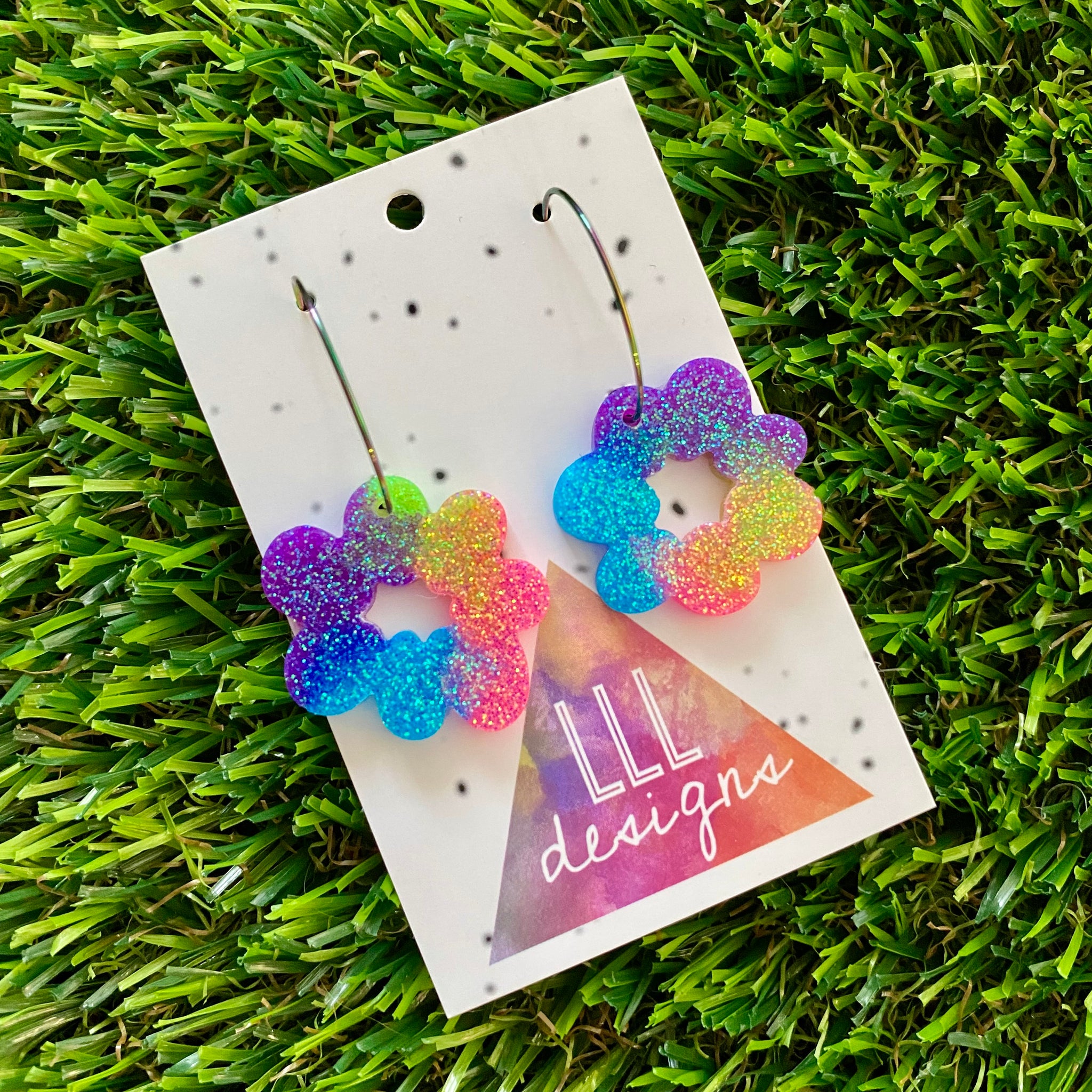 Resin Earrings - Neon Vibrant Floral Wreath Featuring a Rainbow Hoop!