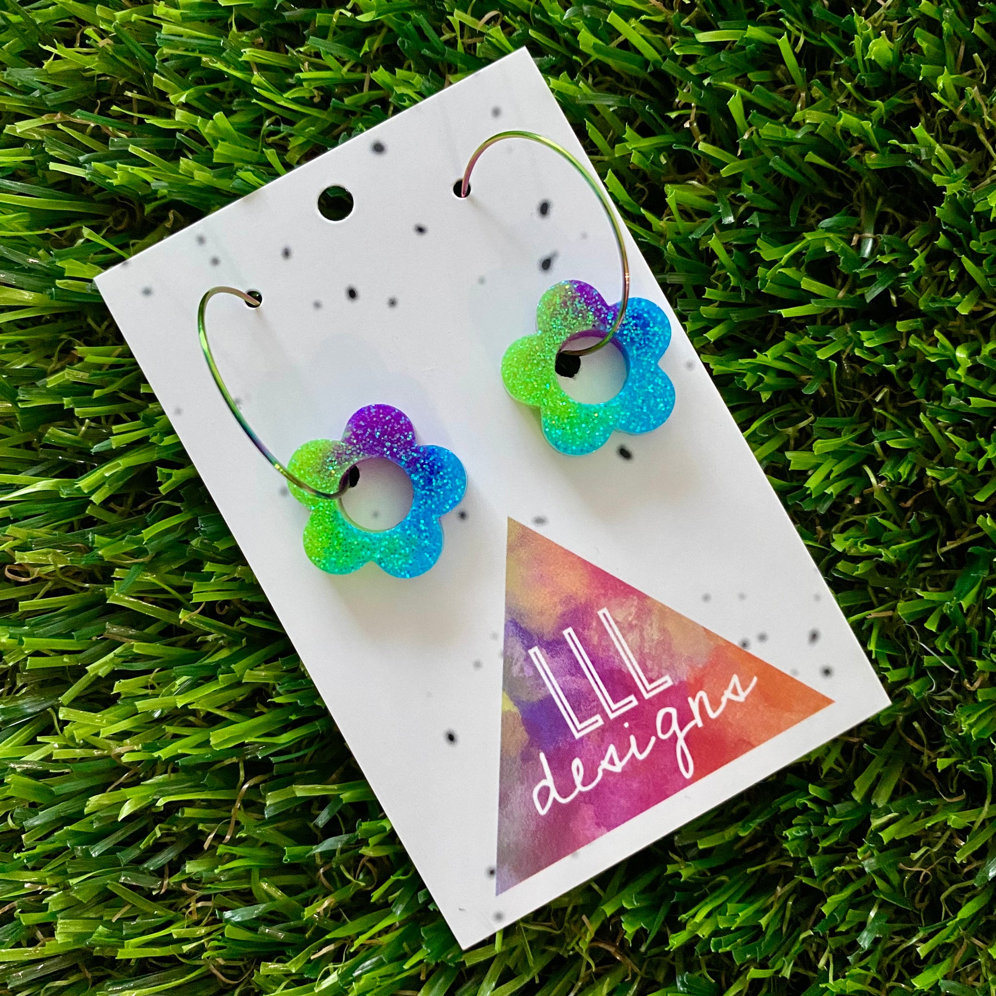 Resin Earrings - Neon Vibrant Mini Daisy Featuring a Rainbow Hoop! (2)