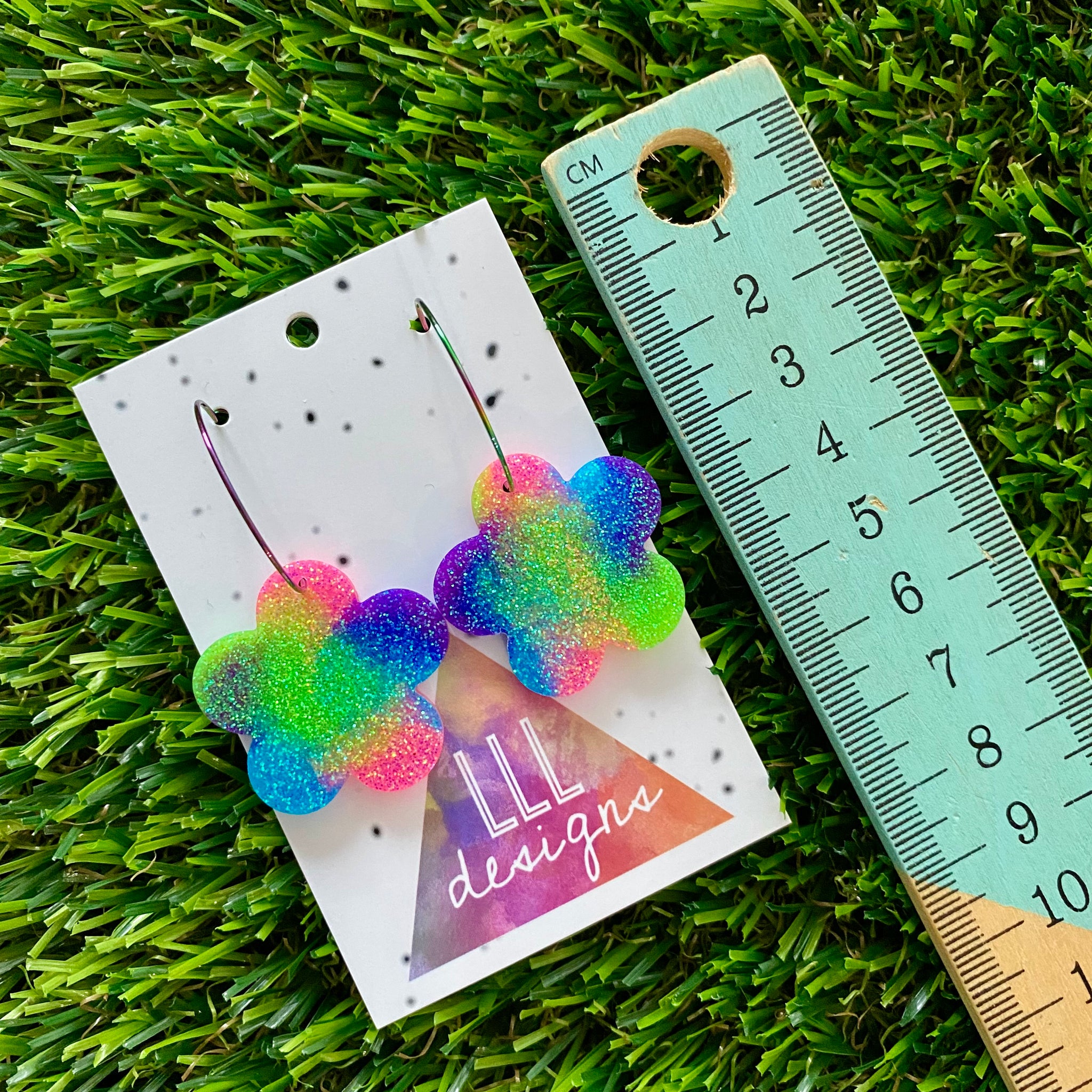 Scroll through photo's to see the size. These are made on 20mm Surgical Stainless Steel Hoops, making them perfect for people with sensitive ears.