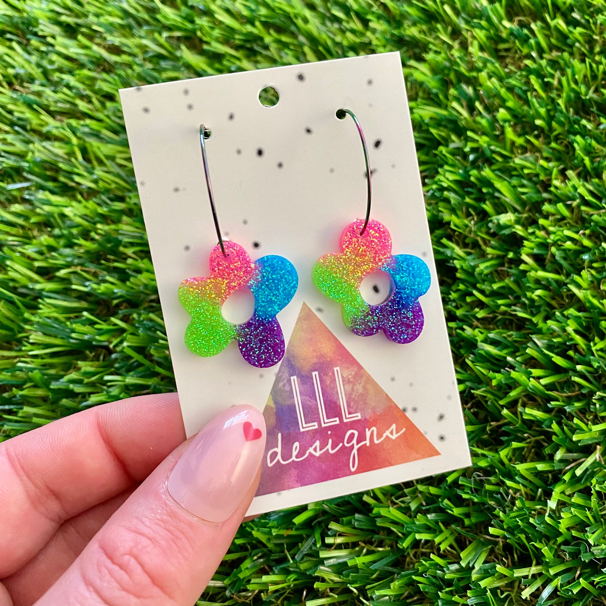 Resin Earrings - Neon Vibrant Wonky Daisy Featuring a Rainbow Hoop!