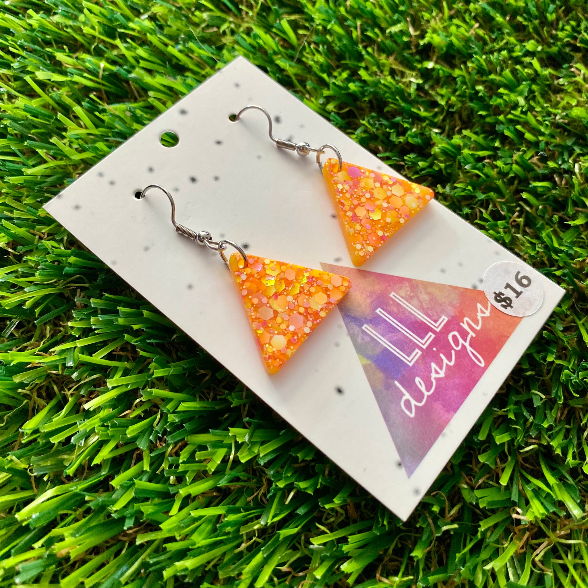Resin Earrings - Orange Multi Glitter Triangle Featuring a Hook Top!