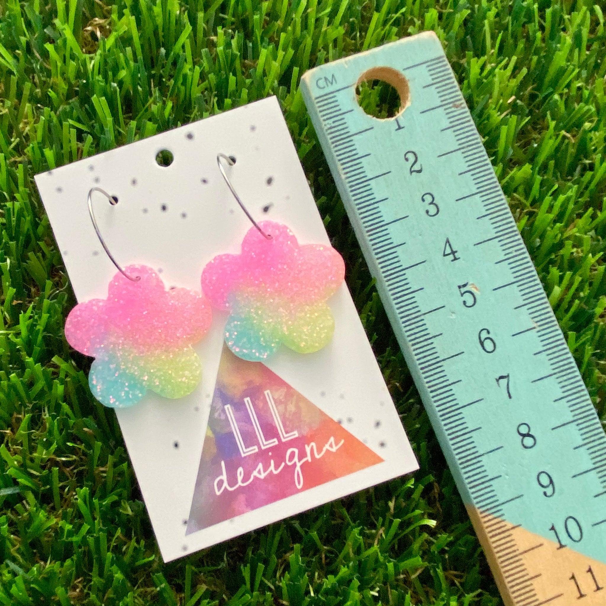 Scroll through photo's to see the size. These are made on 20mm Surgical Stainless Steel Hoops, making them perfect for people with sensitive ears.