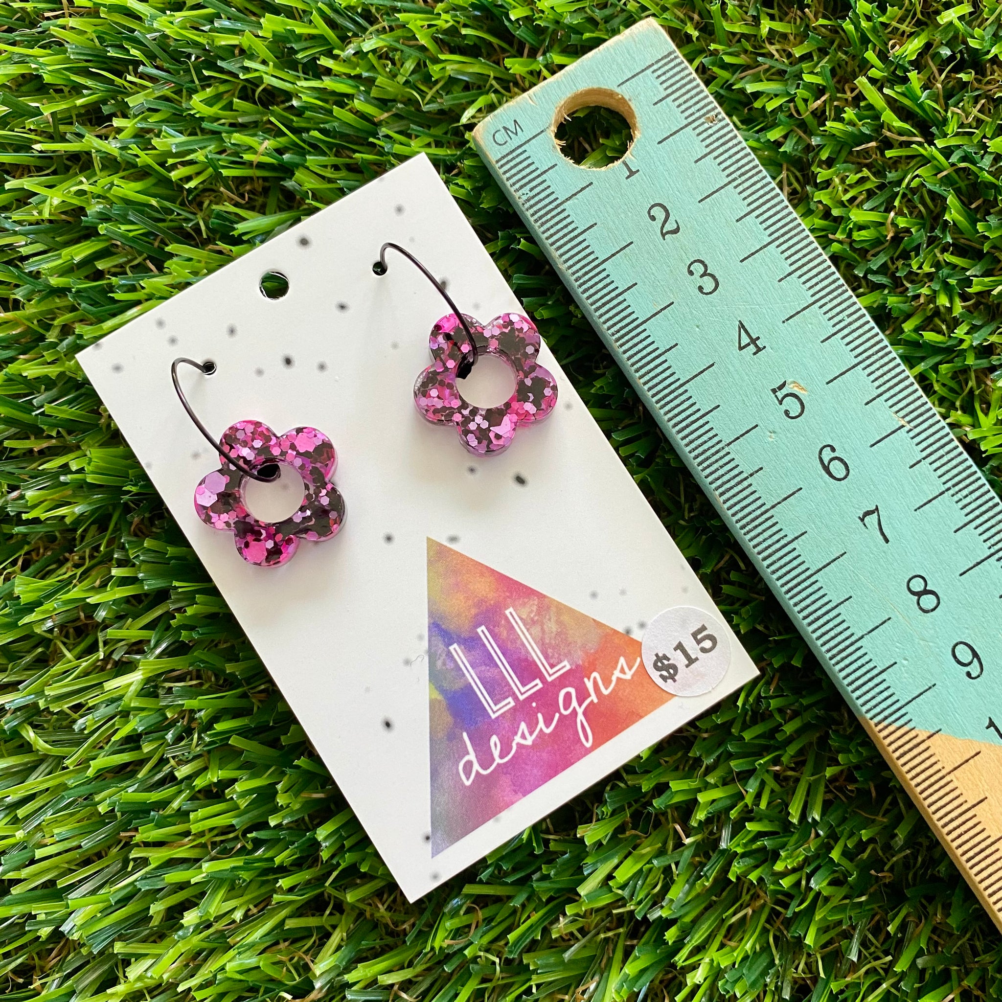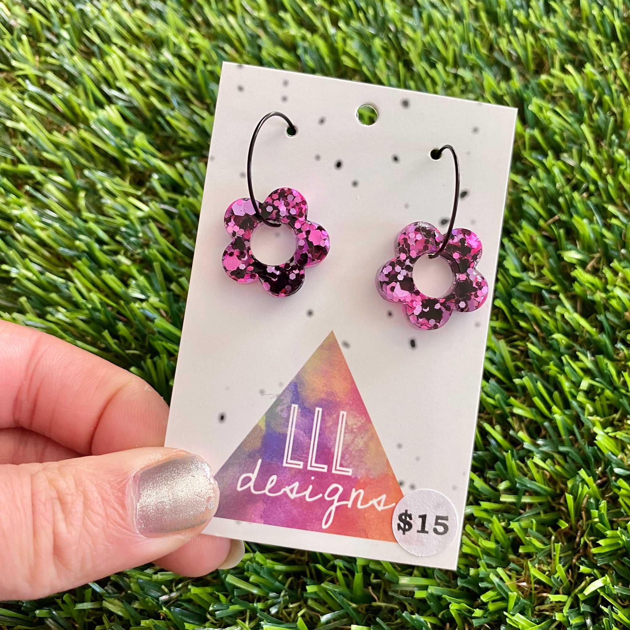 Resin Earrings - Pink and Black Confetti Dangles - Mini Daisies Featuring a Black Hoop!
