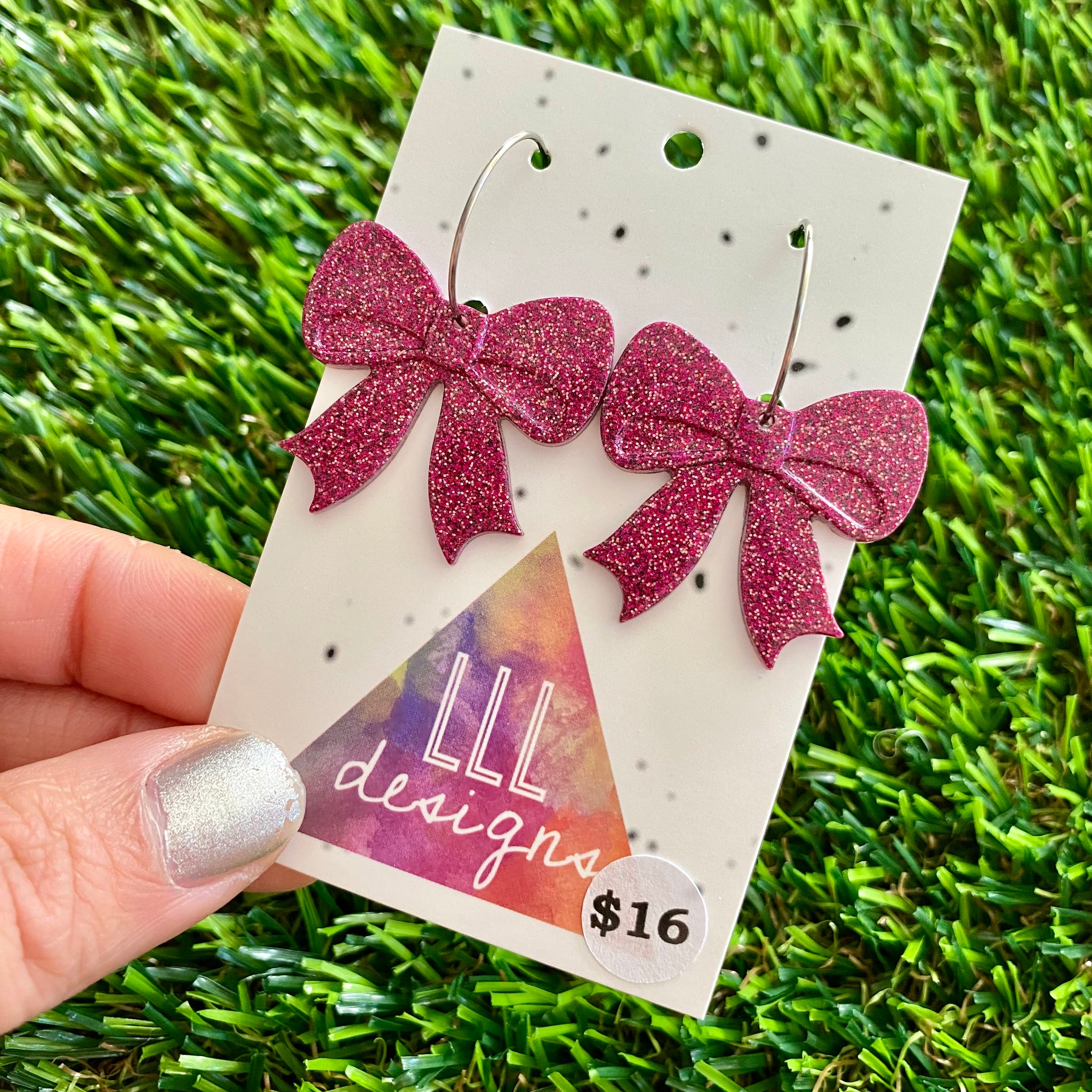 Resin Earrings - Pink Glitter Bows Featuring a Silver Hoop!