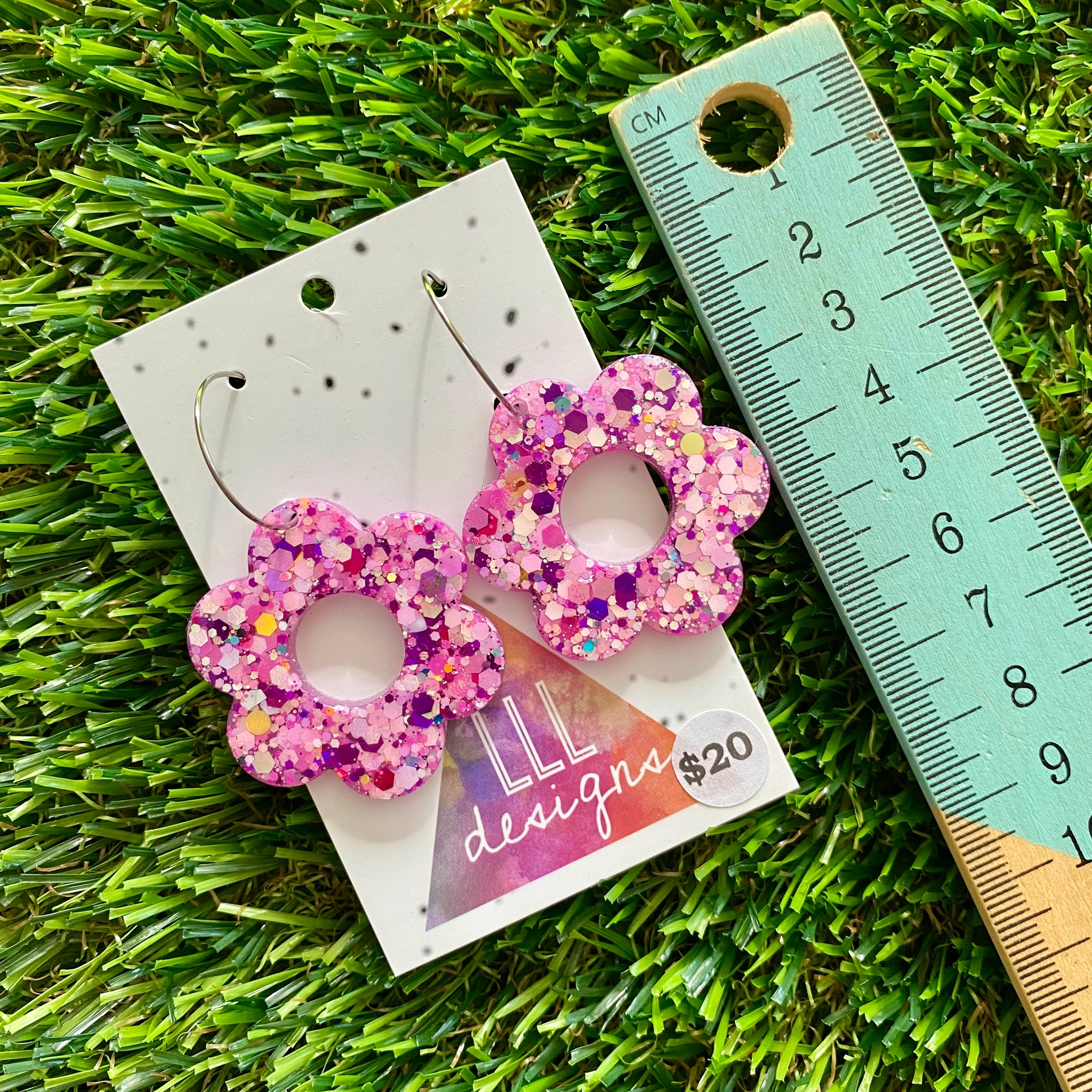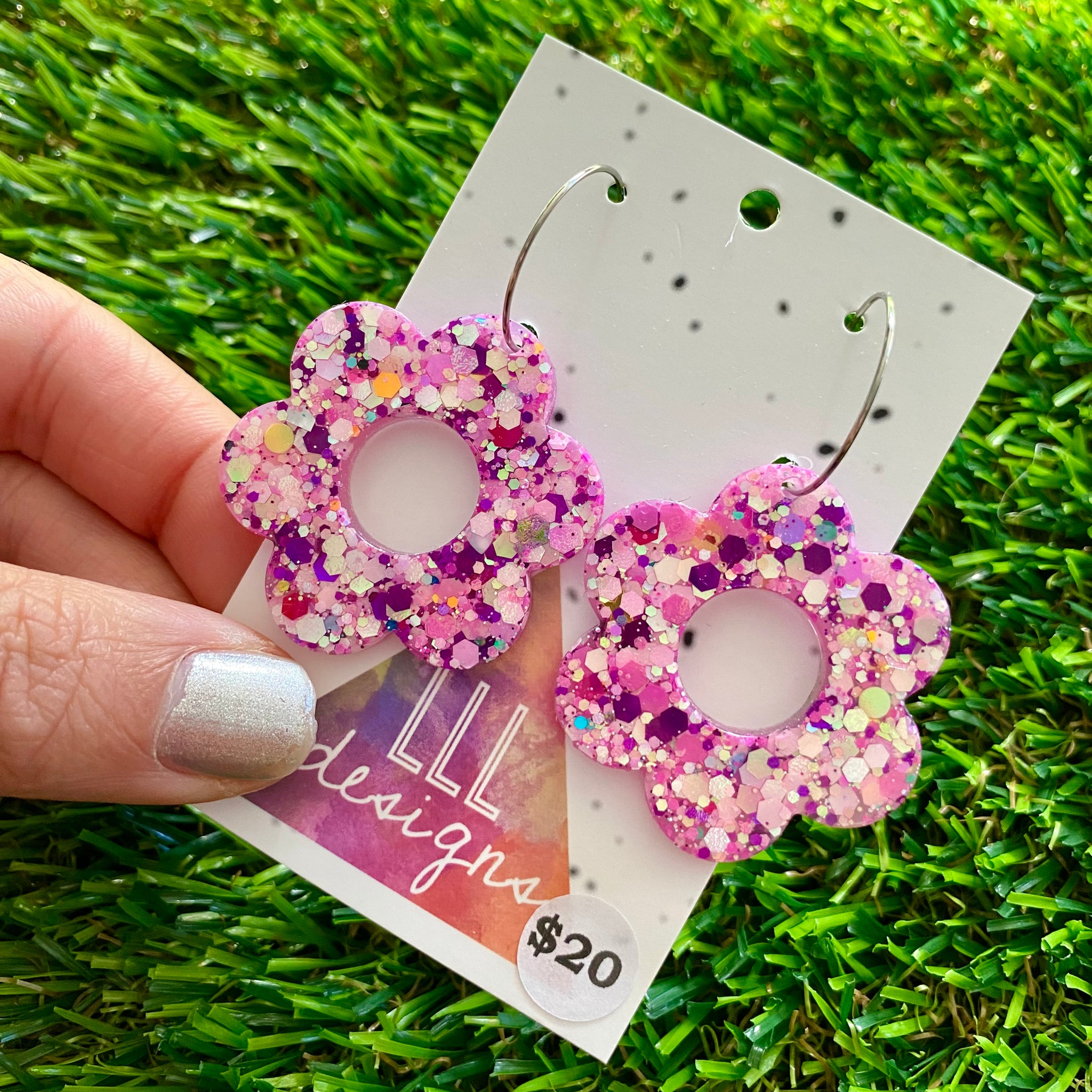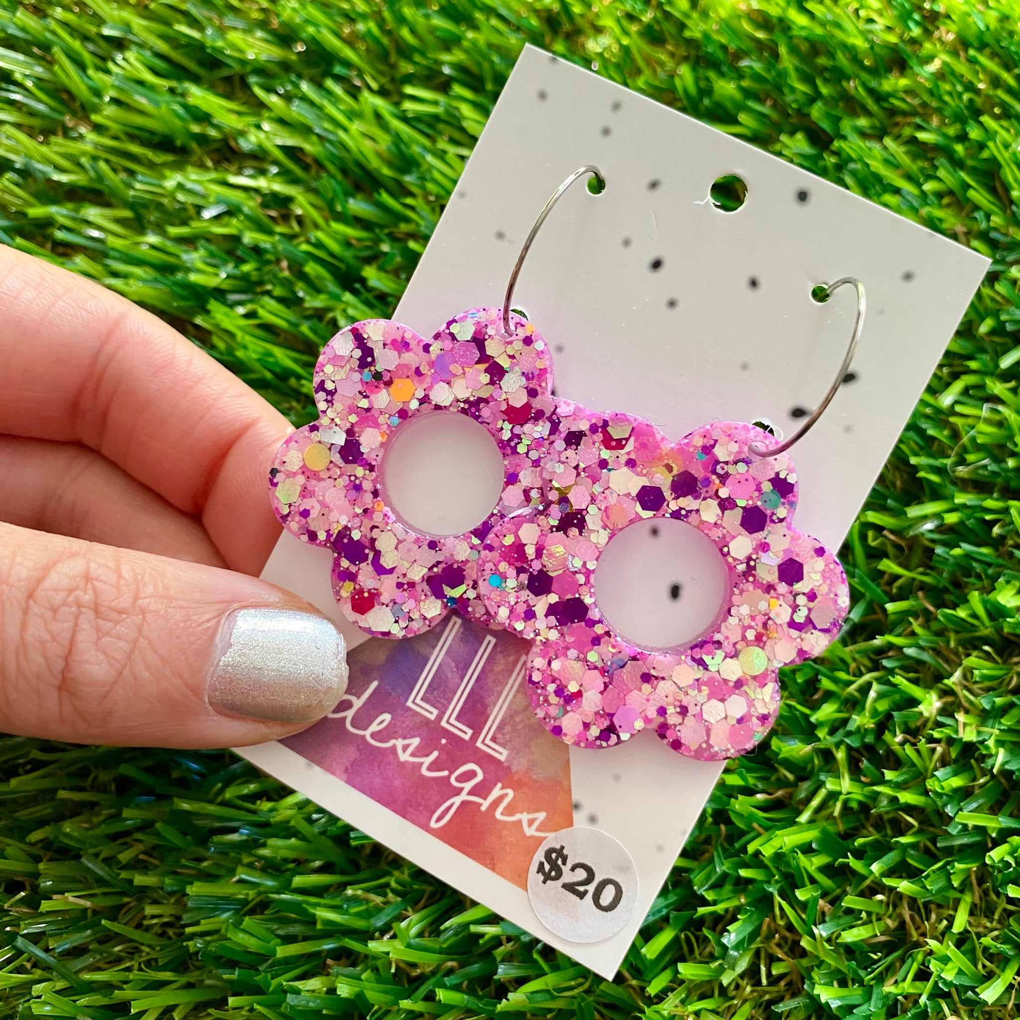 Resin Earrings - Pink Multi Glitter Daisies Featuring a Silver Hoop!