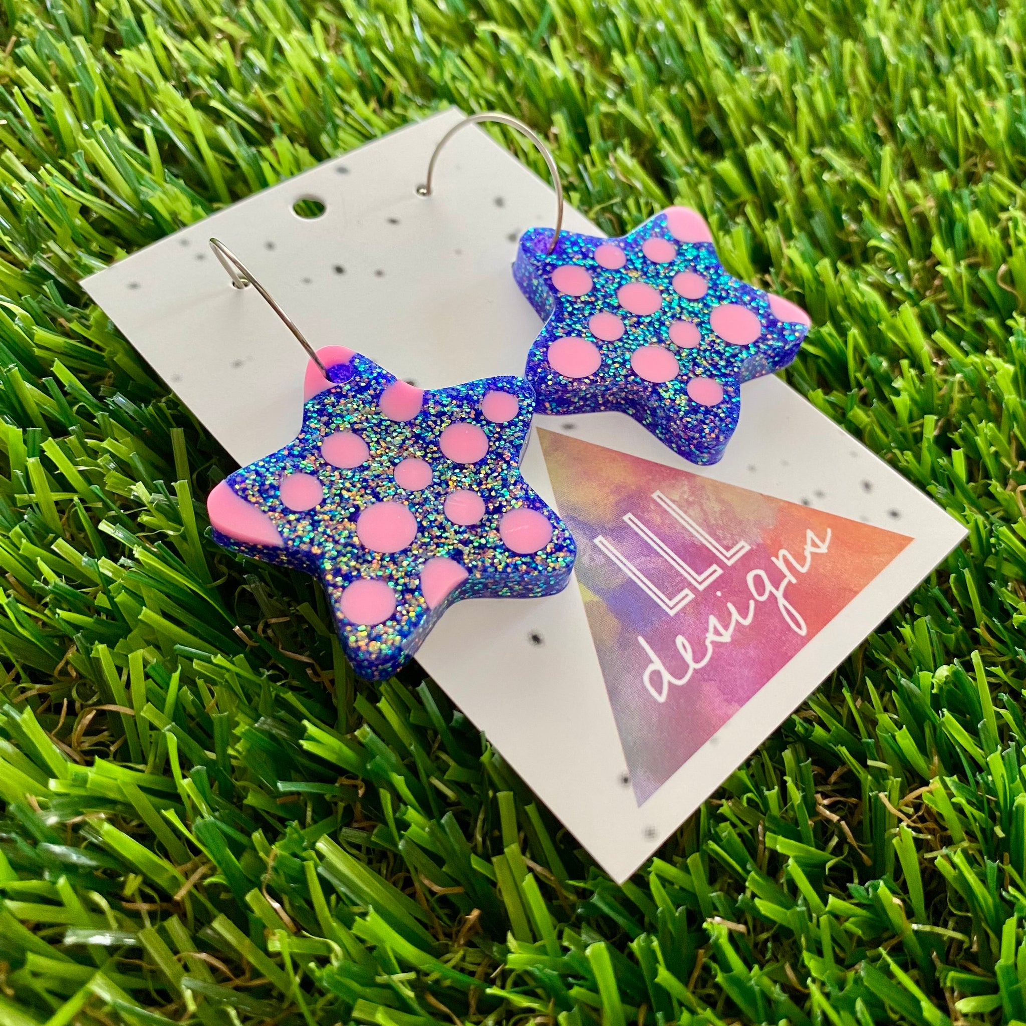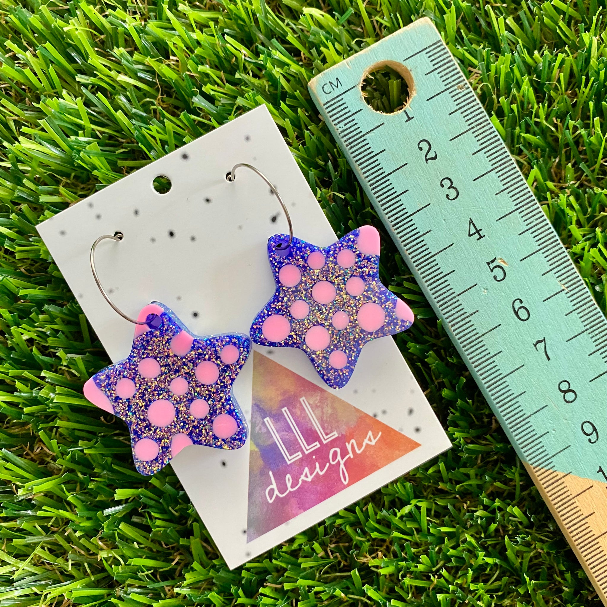 Resin Earrings - Polka Dotted Galaxy Purple Stars in Large Featuring a Silver Hoop! (1)