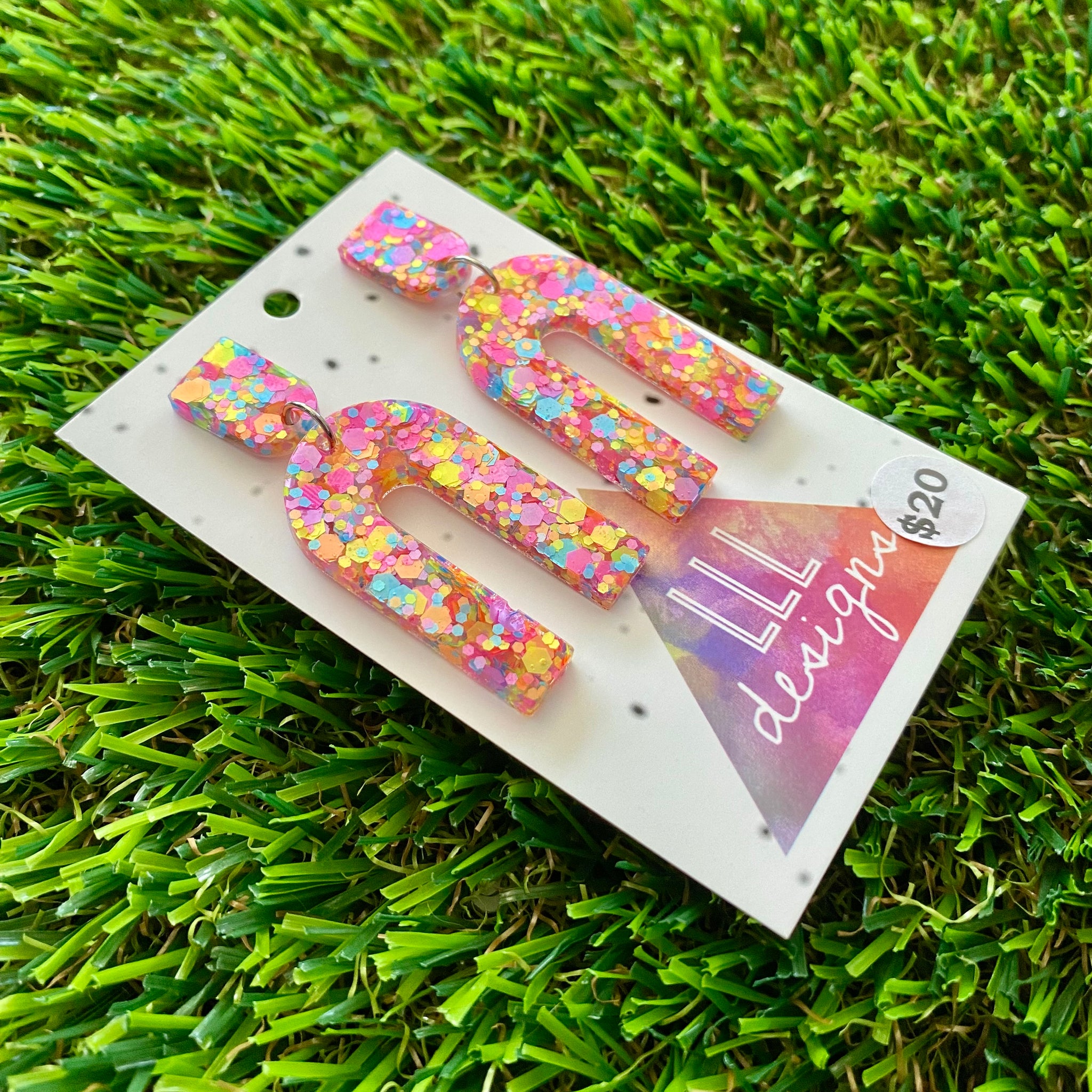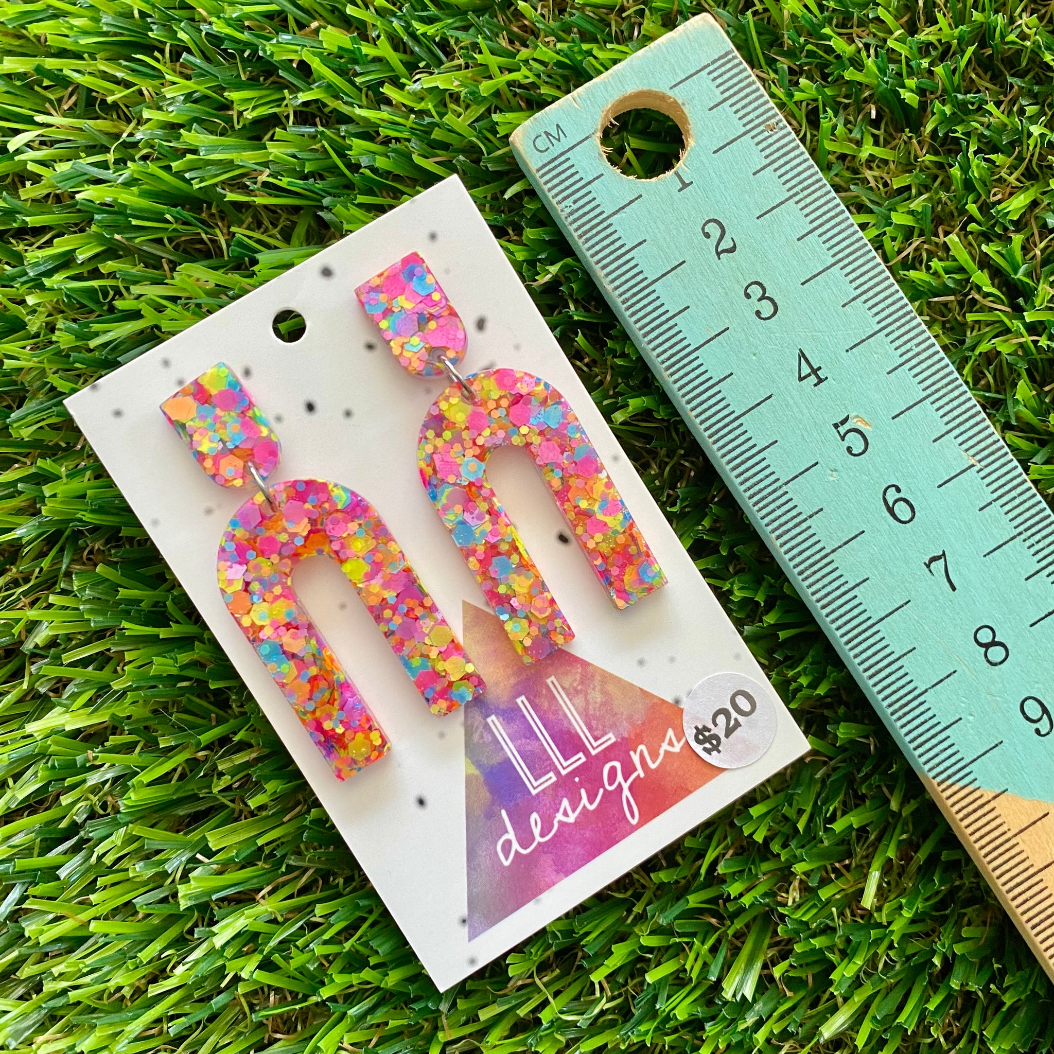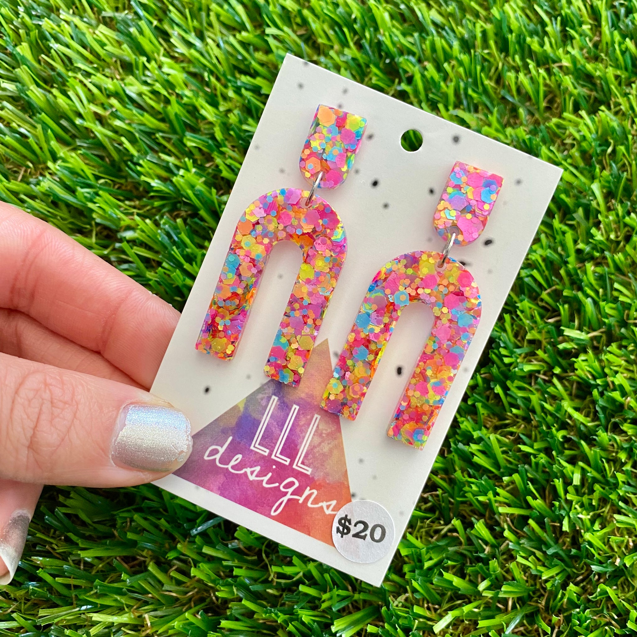 Resin Earrings - Rainbow Confetti Open Arches Dangles!