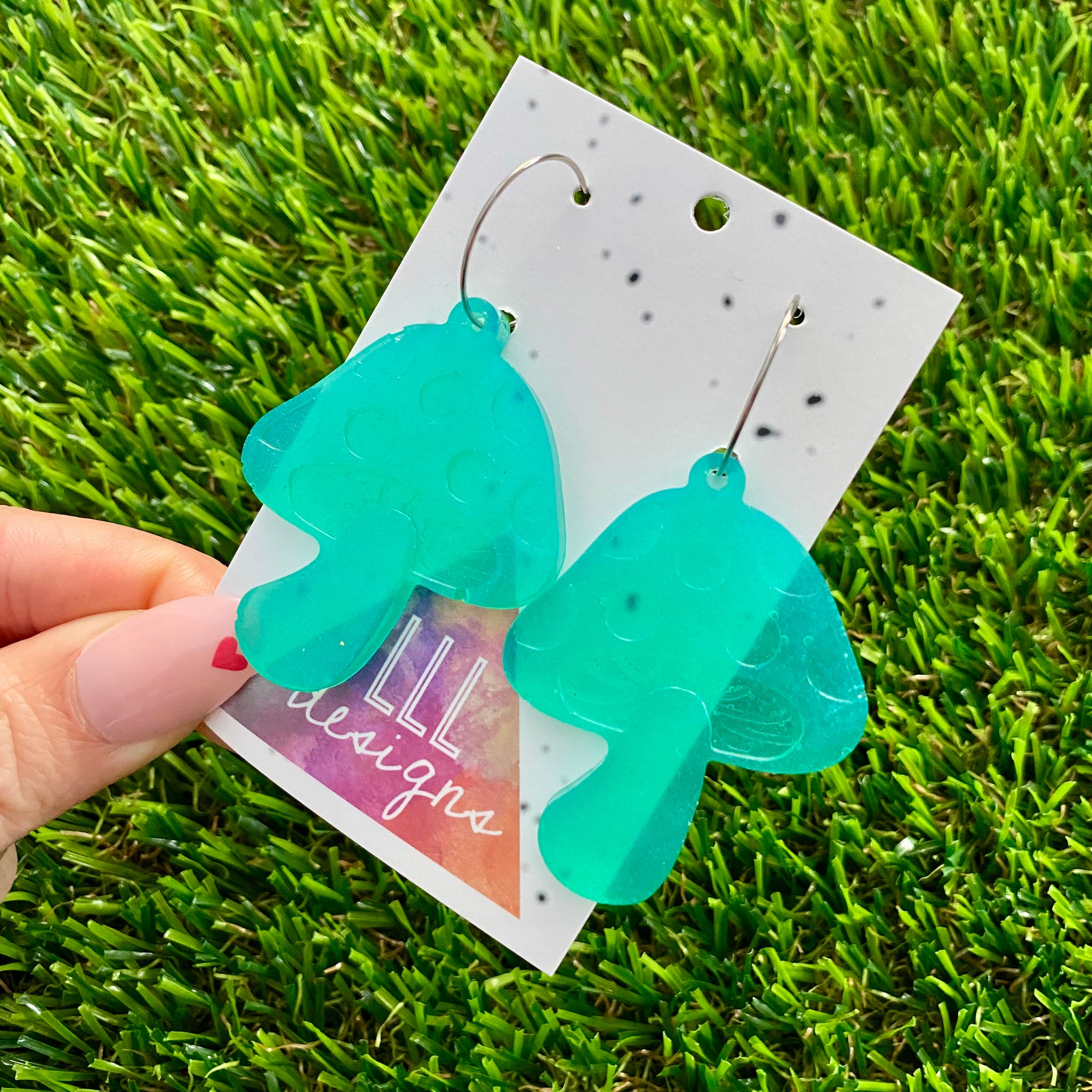 Resin Earrings - Teal Mushroom Featuring a Silver Hoop!