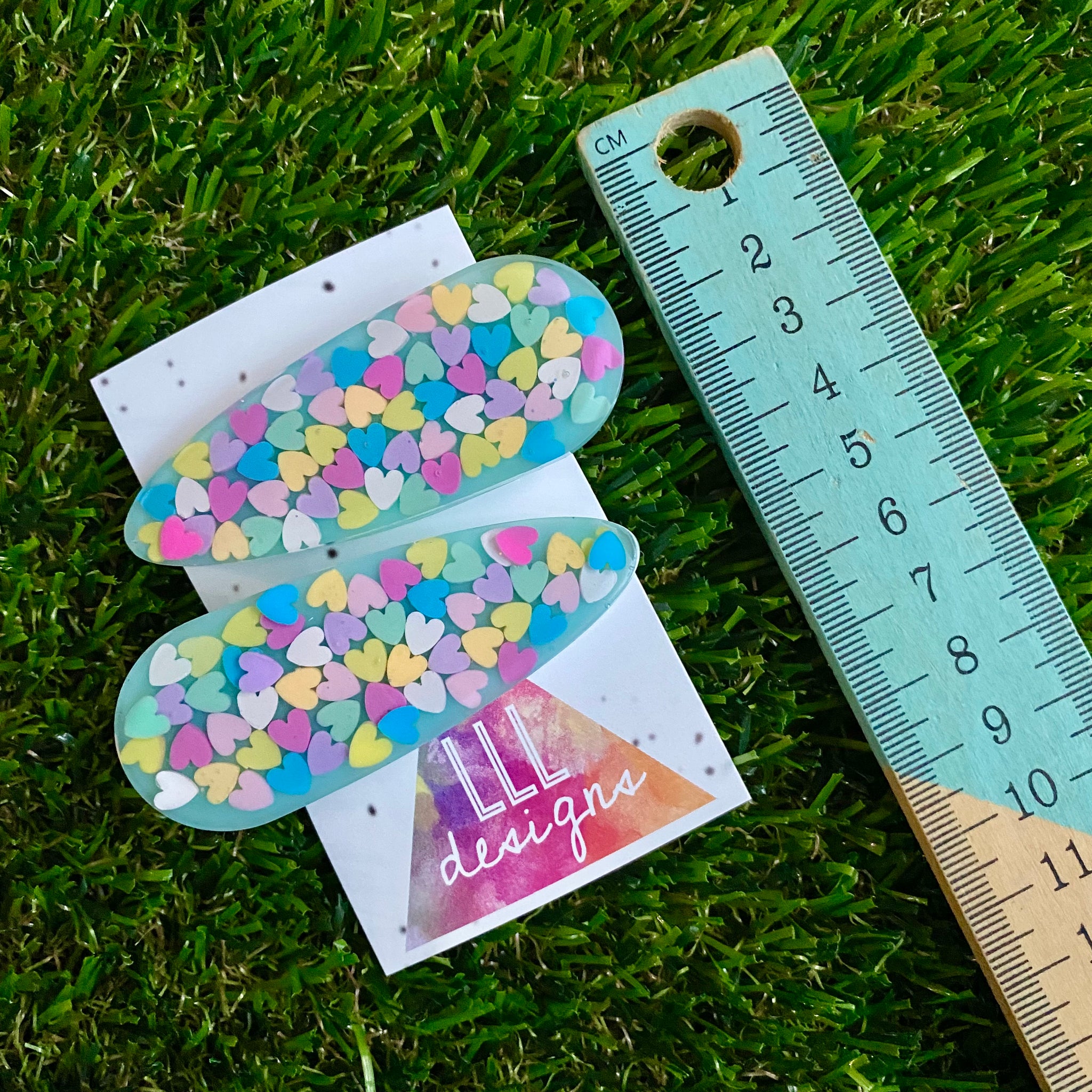Scroll through photo's to see the size. These handmade duel layered hair clips feature a clear layer and coloured layer which encases tiny heart pieces, which are hand placed.