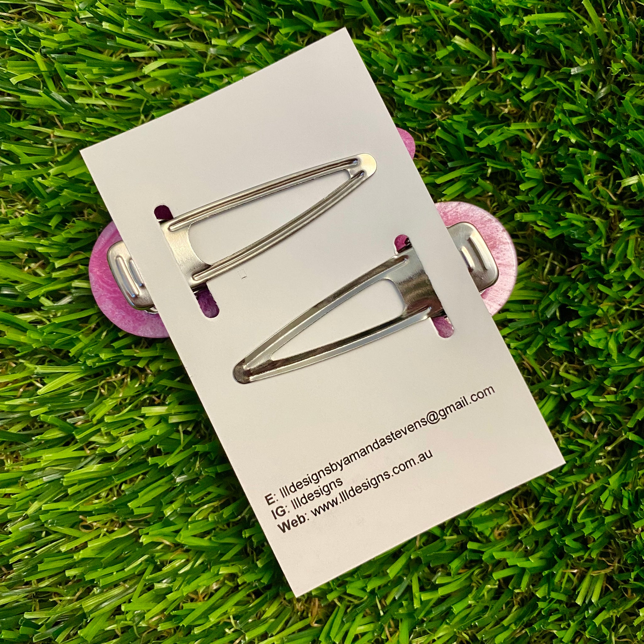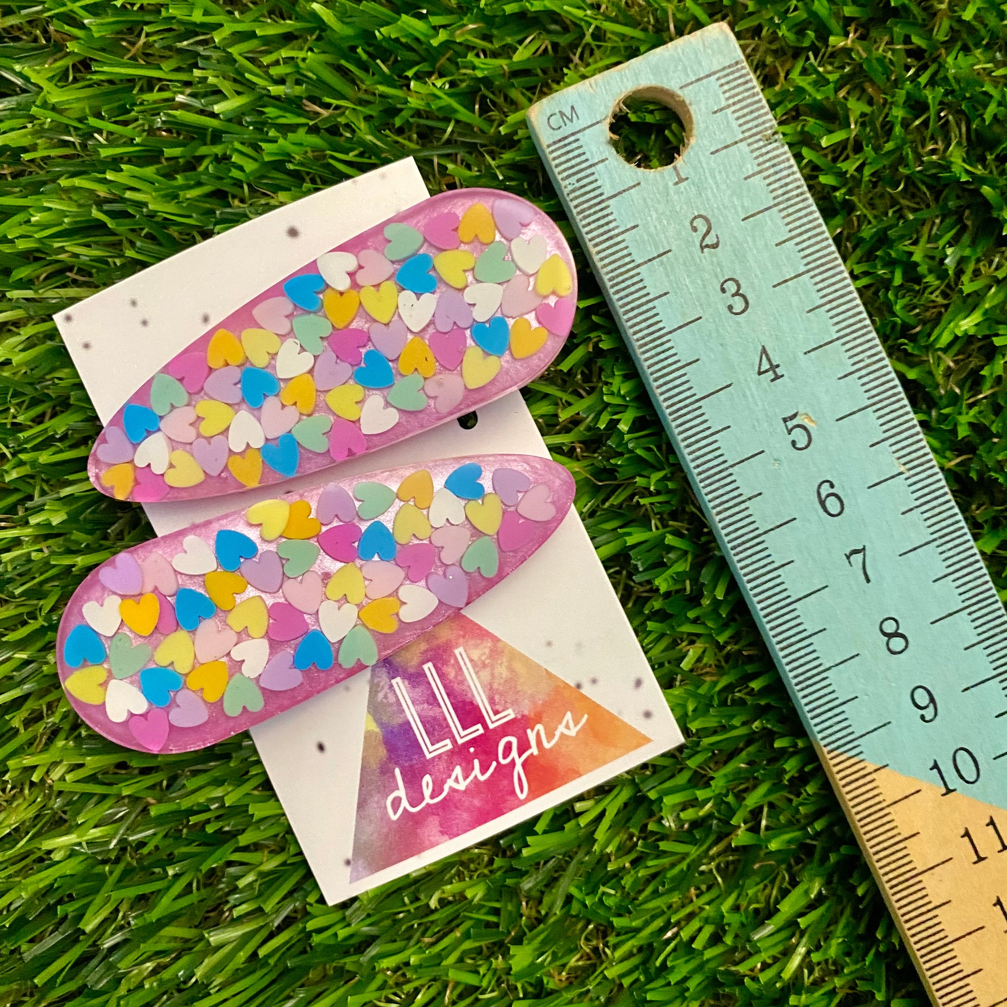 Scroll through photo's to see the size. These handmade duel layered hair clips feature a clear layer and coloured layer which encases tiny heart pieces, which are hand placed.