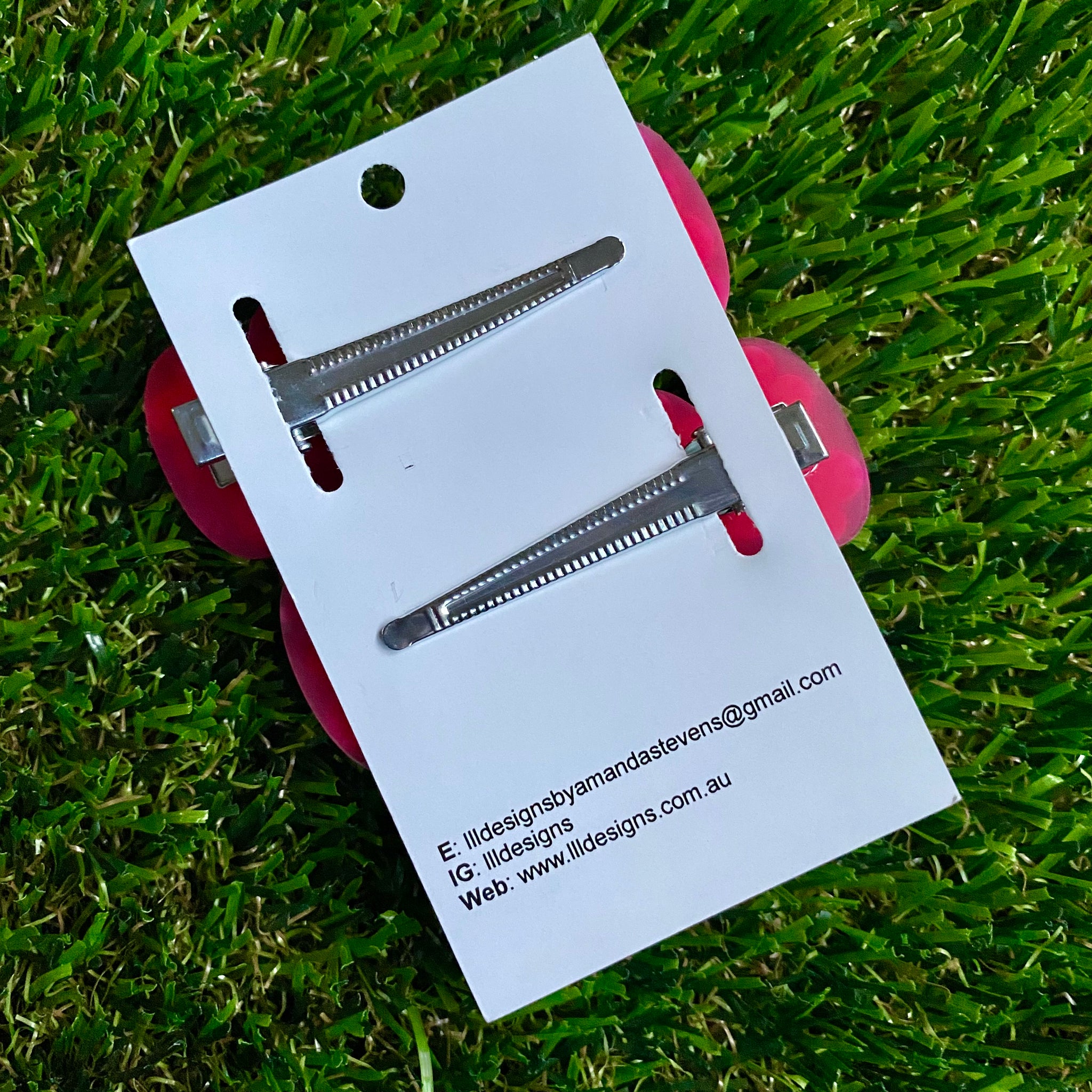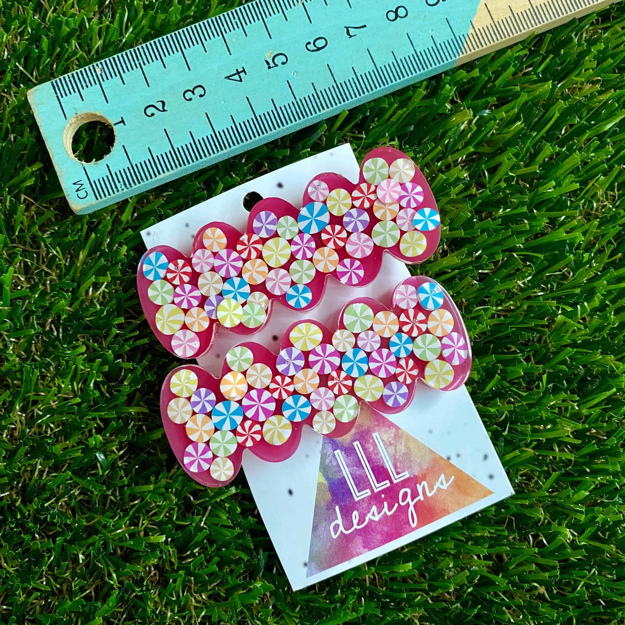 Scroll through photo's to see the size. These handmade duel layered hair clips feature a clear layer and coloured layer which encases tiny sweet pieces, which are hand placed.