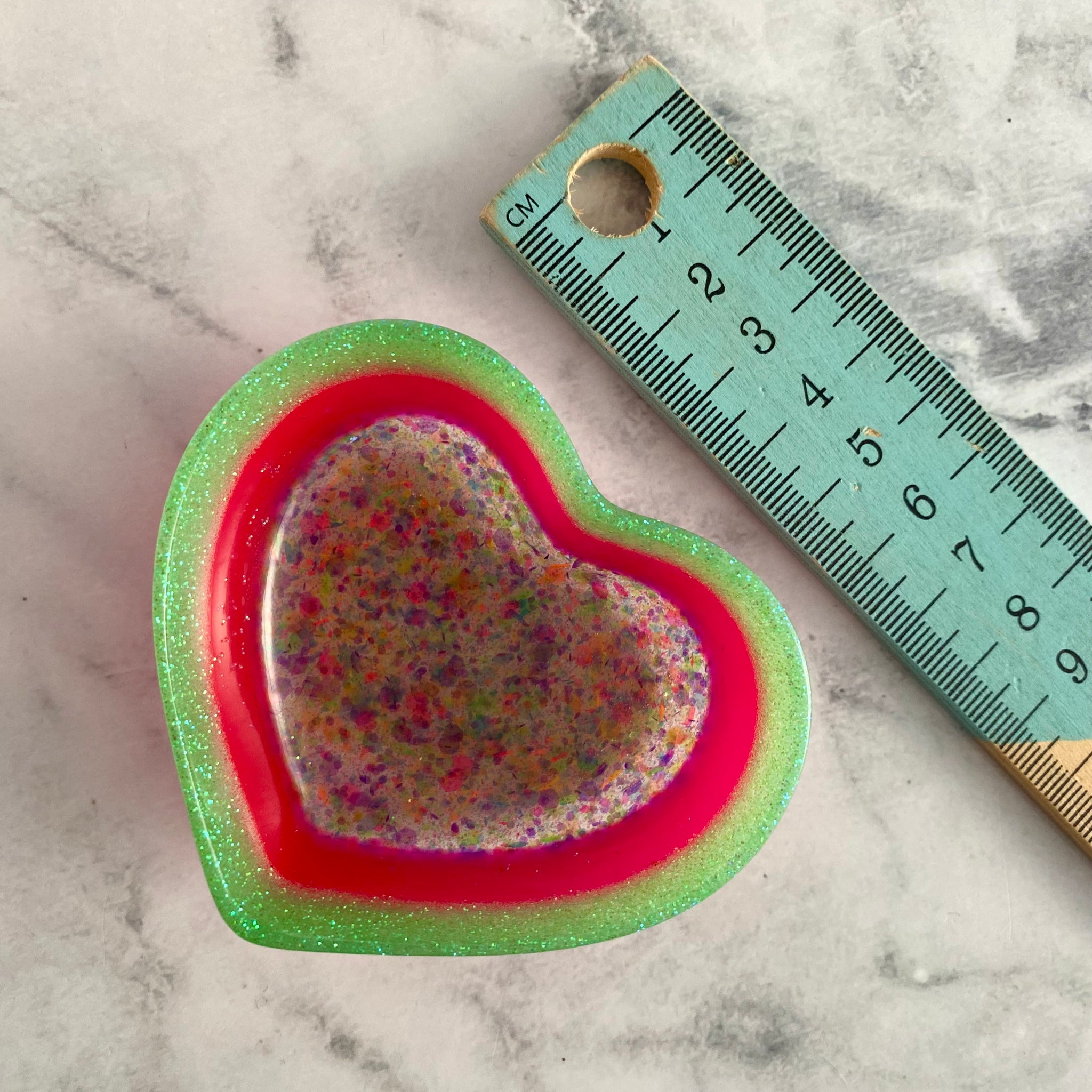 Resin Heart Dish - Three Tone Rainbow Confetti featuring a Rainbow Confetti Base, Bright Pink Middle and Green Border! Brighten Up Your Life with this Bold and Fun Piece!