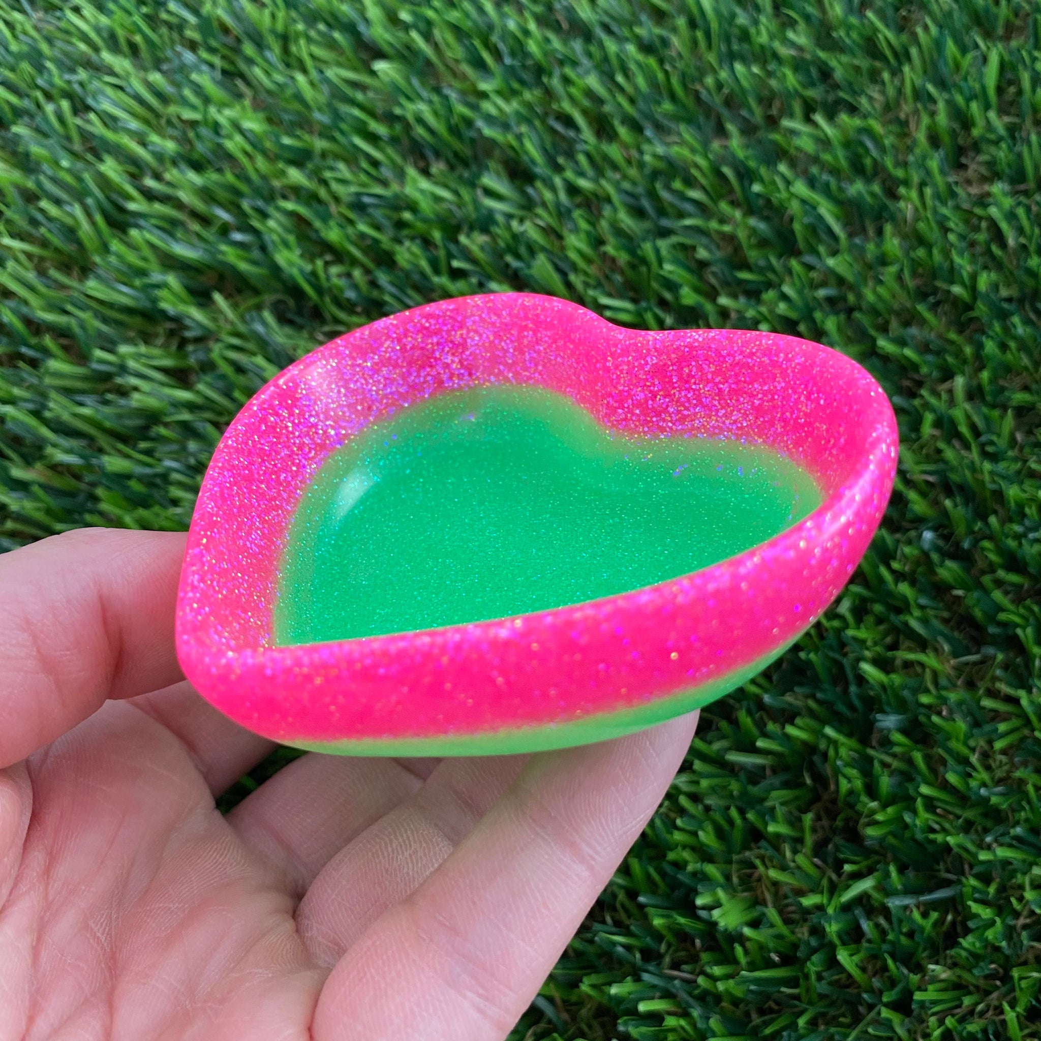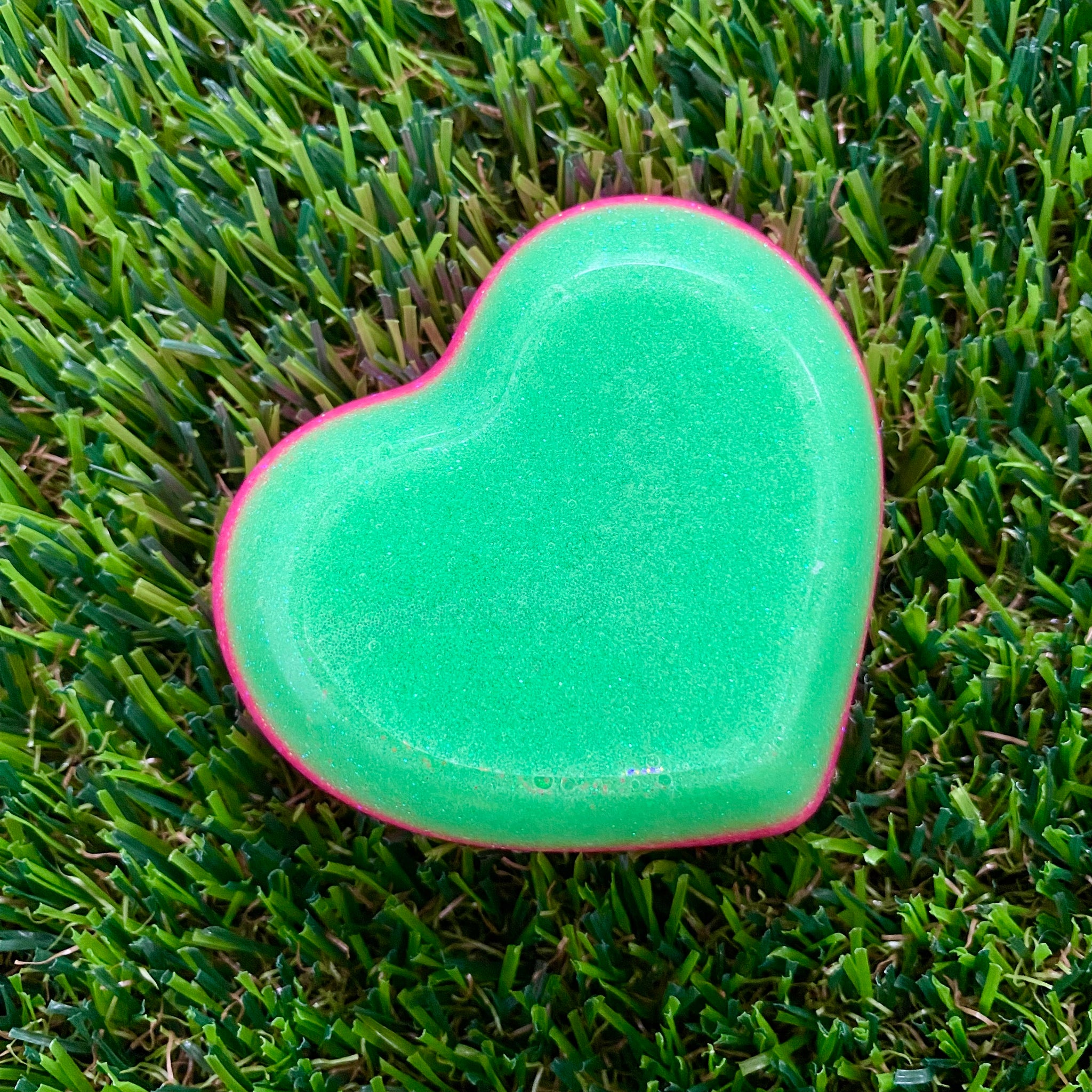 Resin Heart Dish - Two Tone Glitter Neon Green Featuring a Glitter Neon Pink Border! Brighten Up Your Life with this Bold and Fun Piece!
