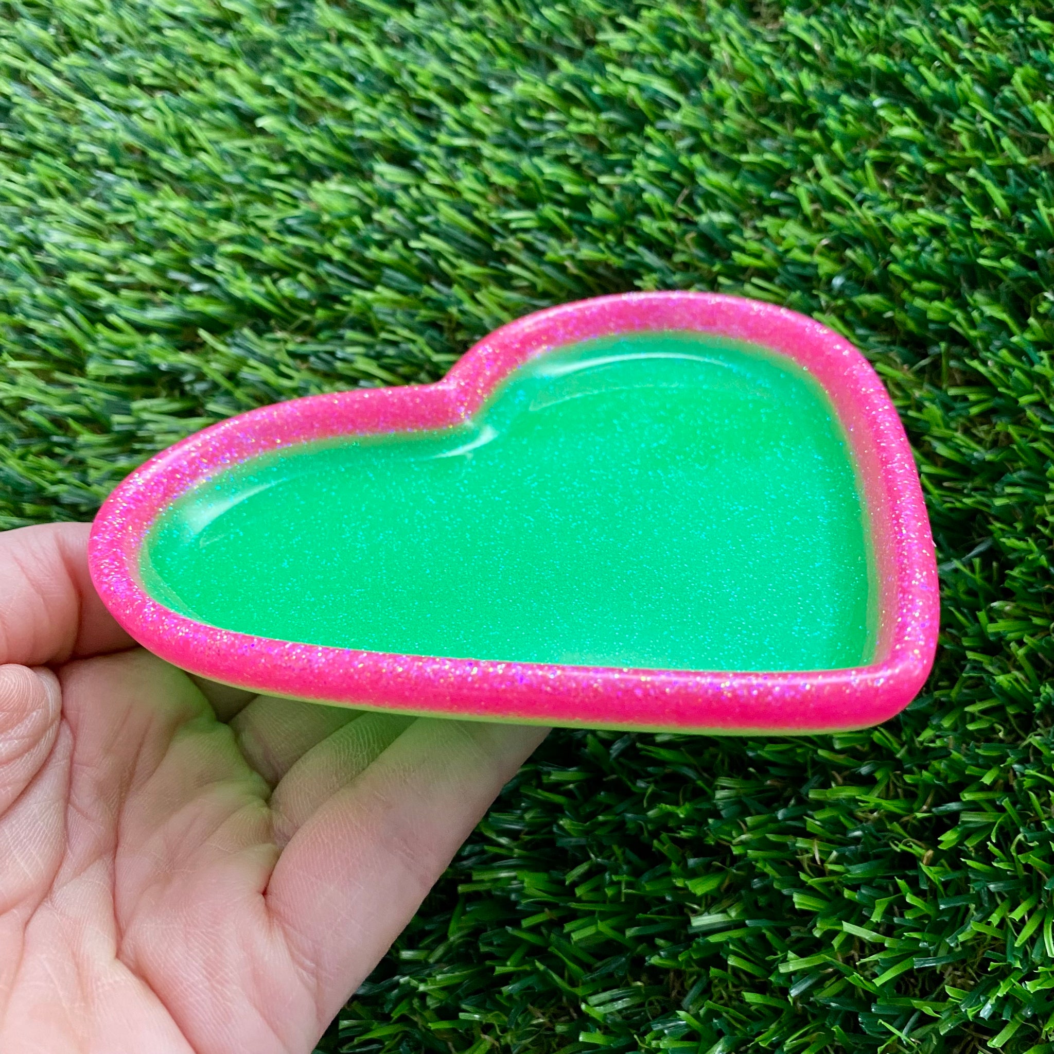 Resin Heart Tray - Two Tone Glitter Neon Green Featuring a Glitter Neon Pink Border! Brighten Up Your Life with this Bold and Fun Piece!