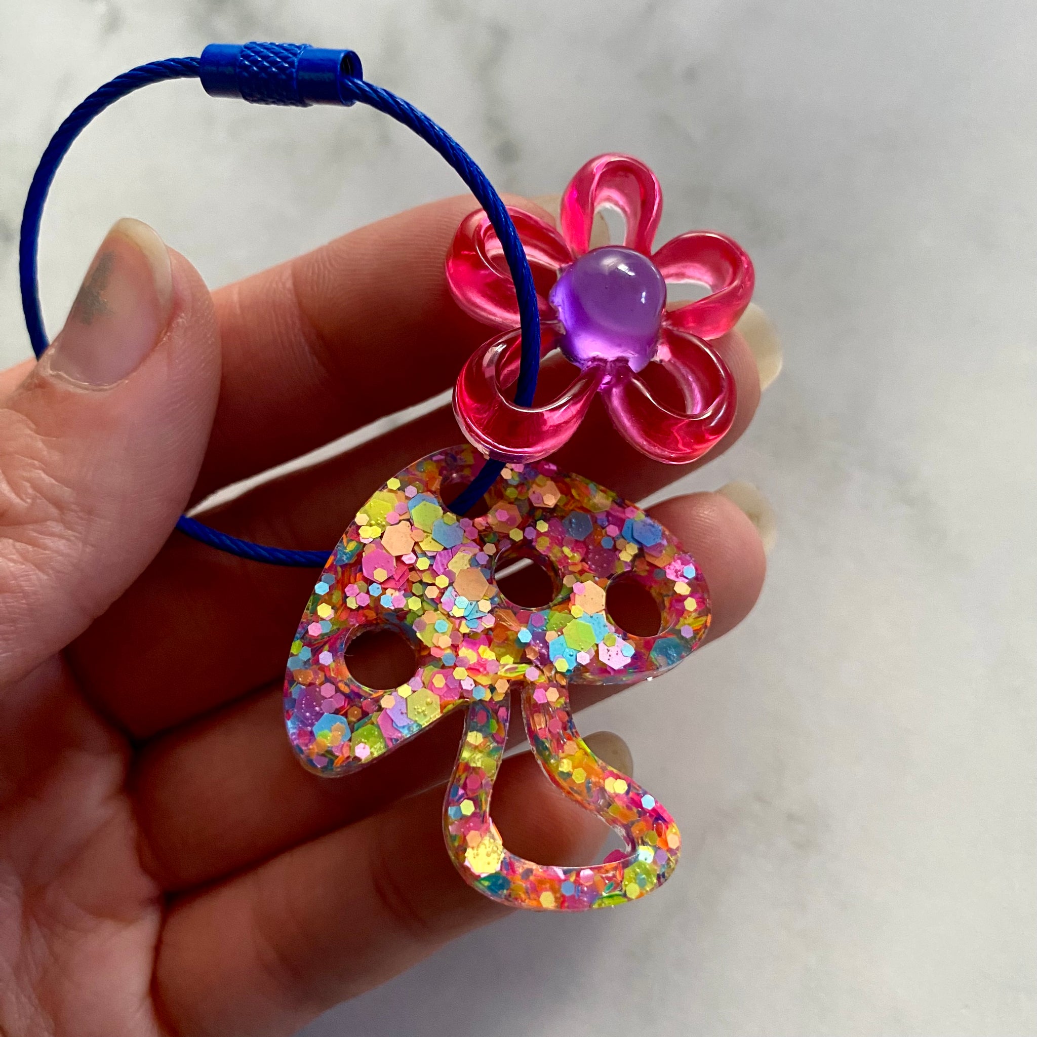 Handmade Resin Keyring / Bagtag - Dark Blue cable featuring Purple & Pink Daisy and Rainbow Confetti Mushroom! (12)