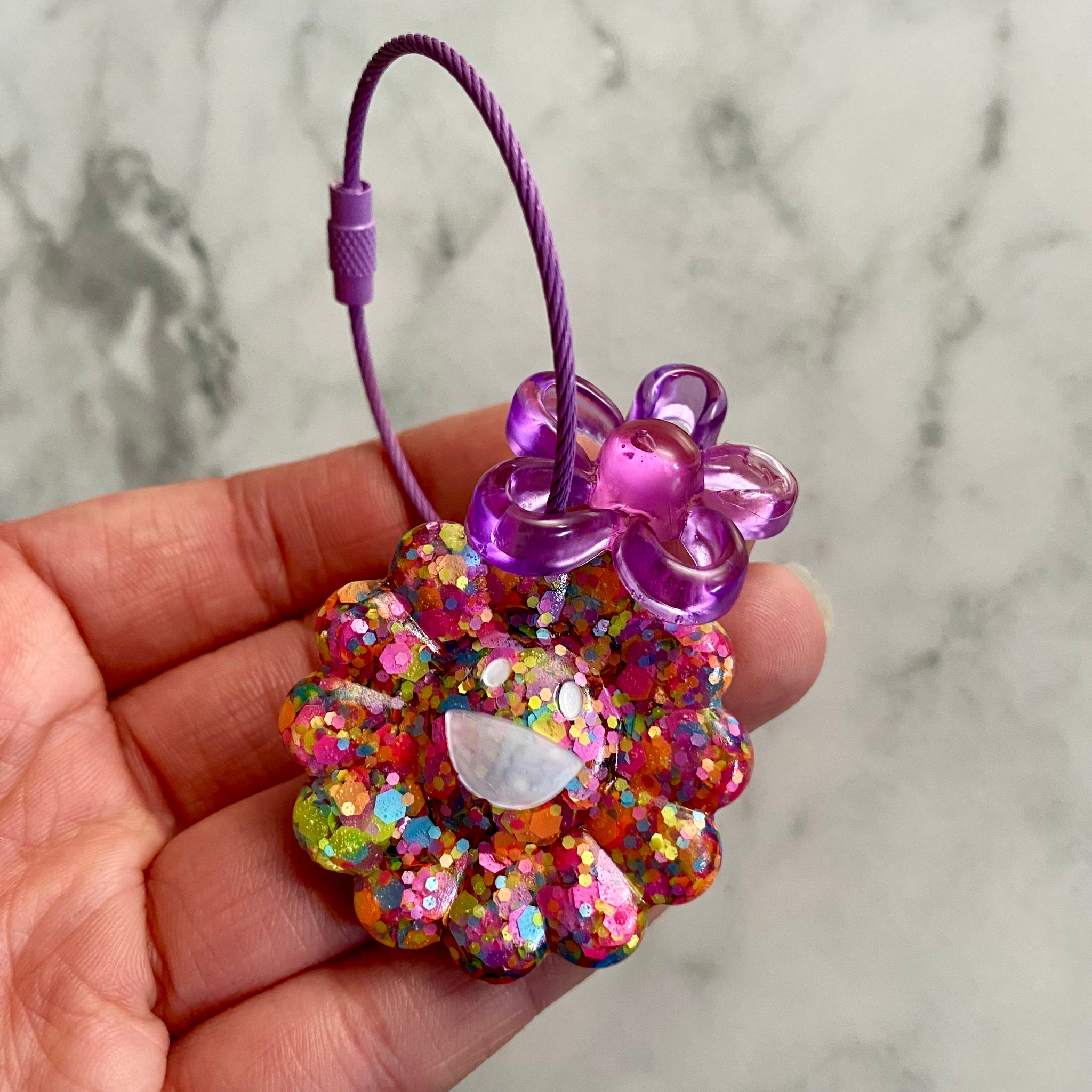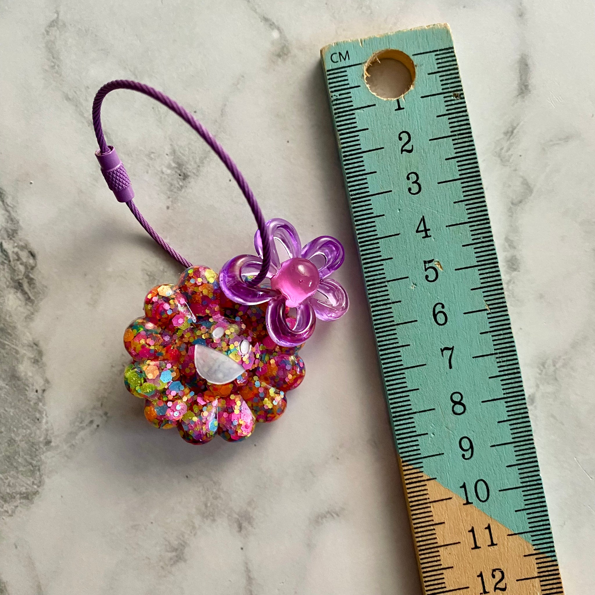 Resin Keyring / Bagtag - Purple cable featuring Pink & Purple Daisy and Rainbow Confetti Smiling Flower! (3)