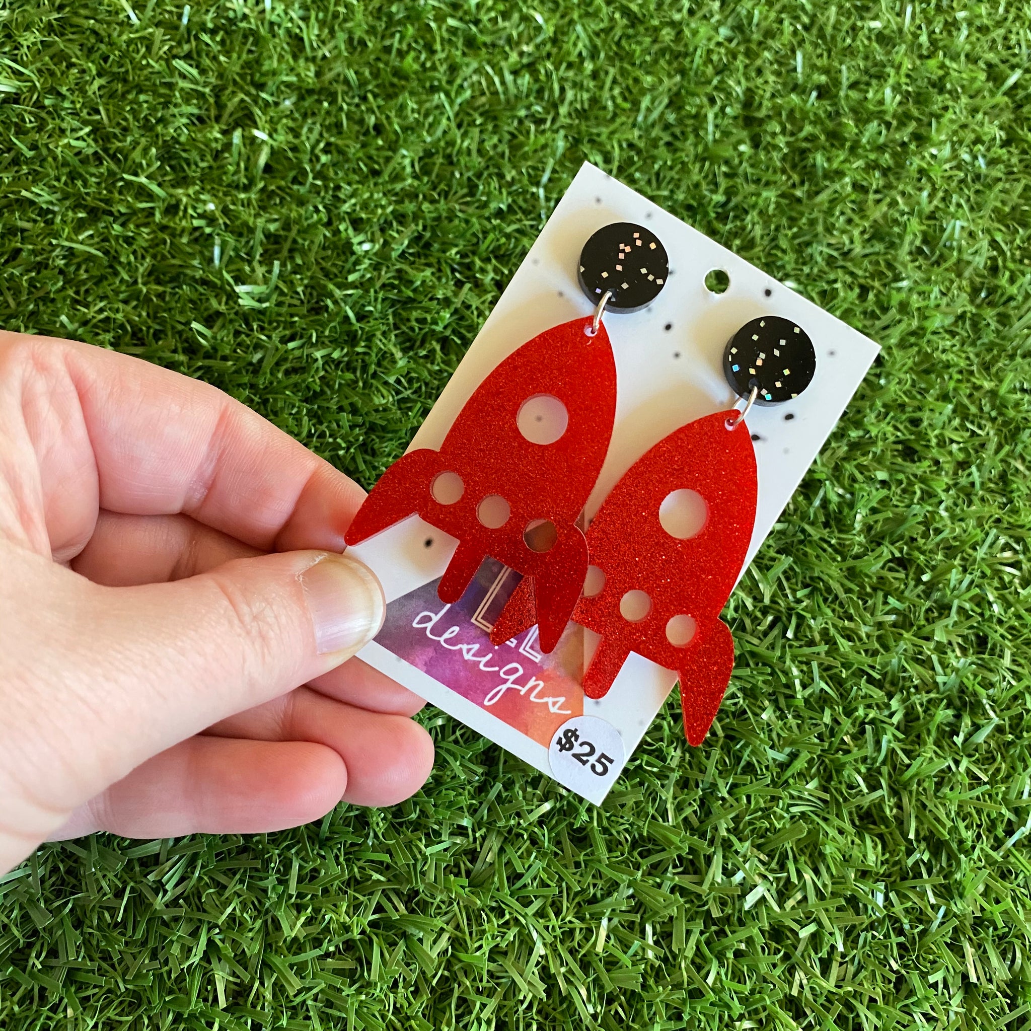 Rocket Ship Earrings - Glitter Red Space Rocket Ship Dangle Earrings - Finished with Galaxy Black Black Tops for a match made in Space!