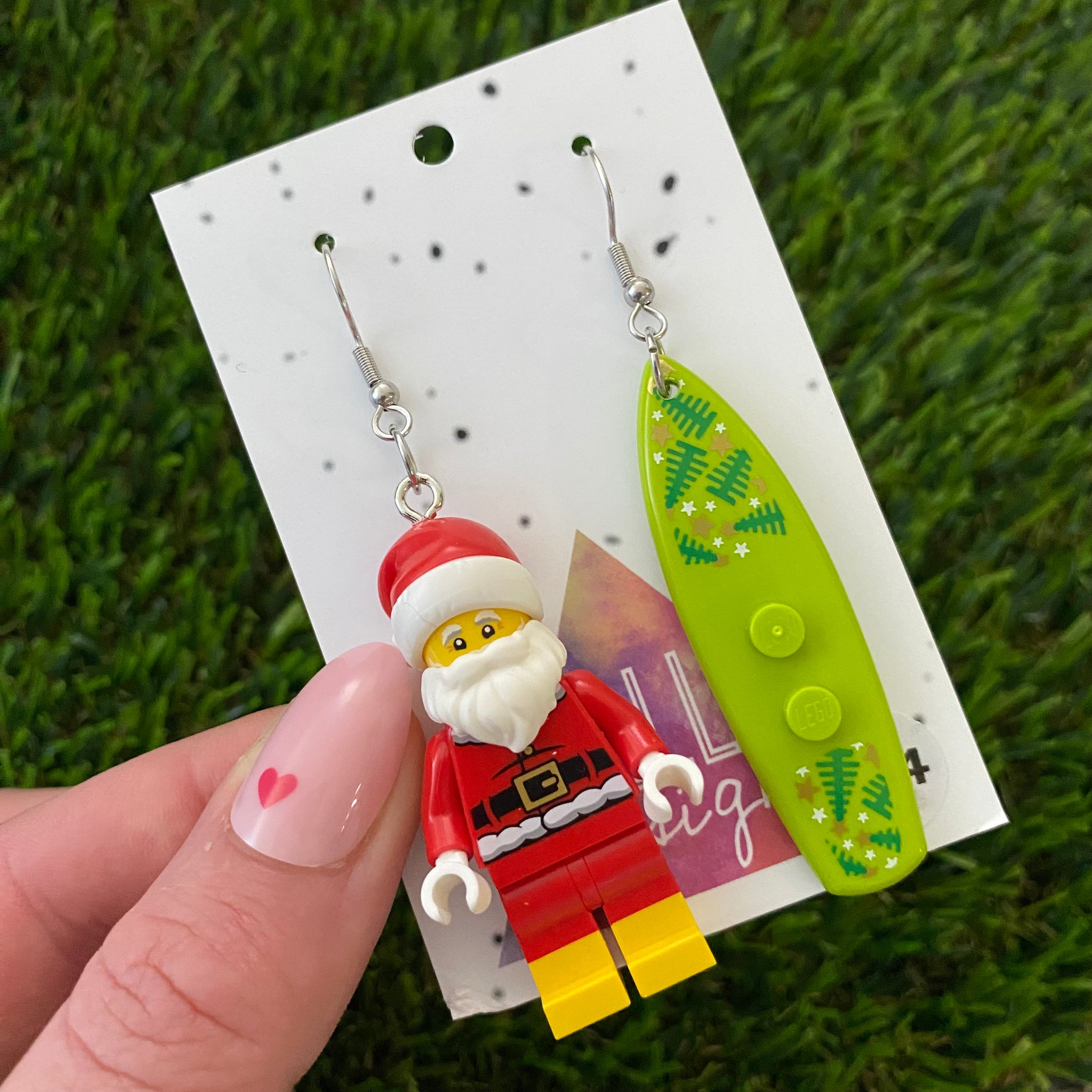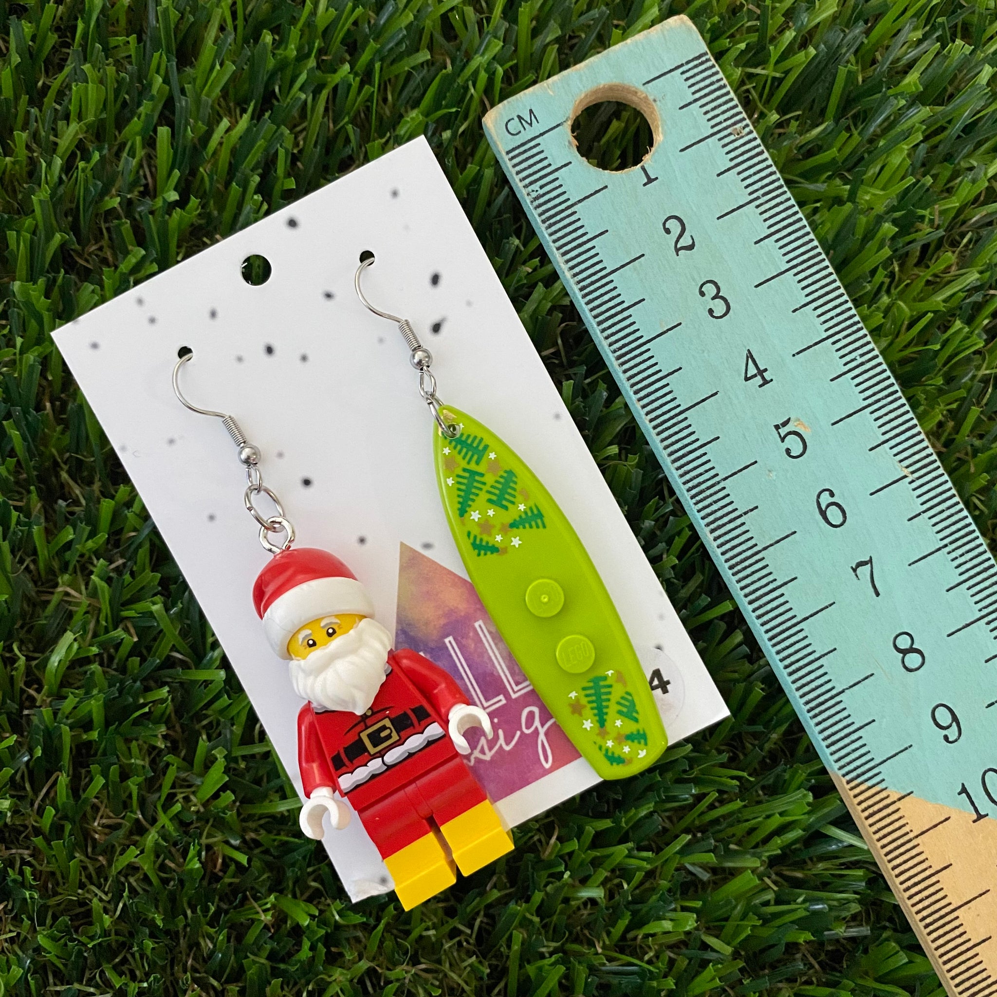 Santa Christmas Brick Earrings- Surfing Santa Festive Earrings, Featuring Surgical Stainless Steel Hooks!