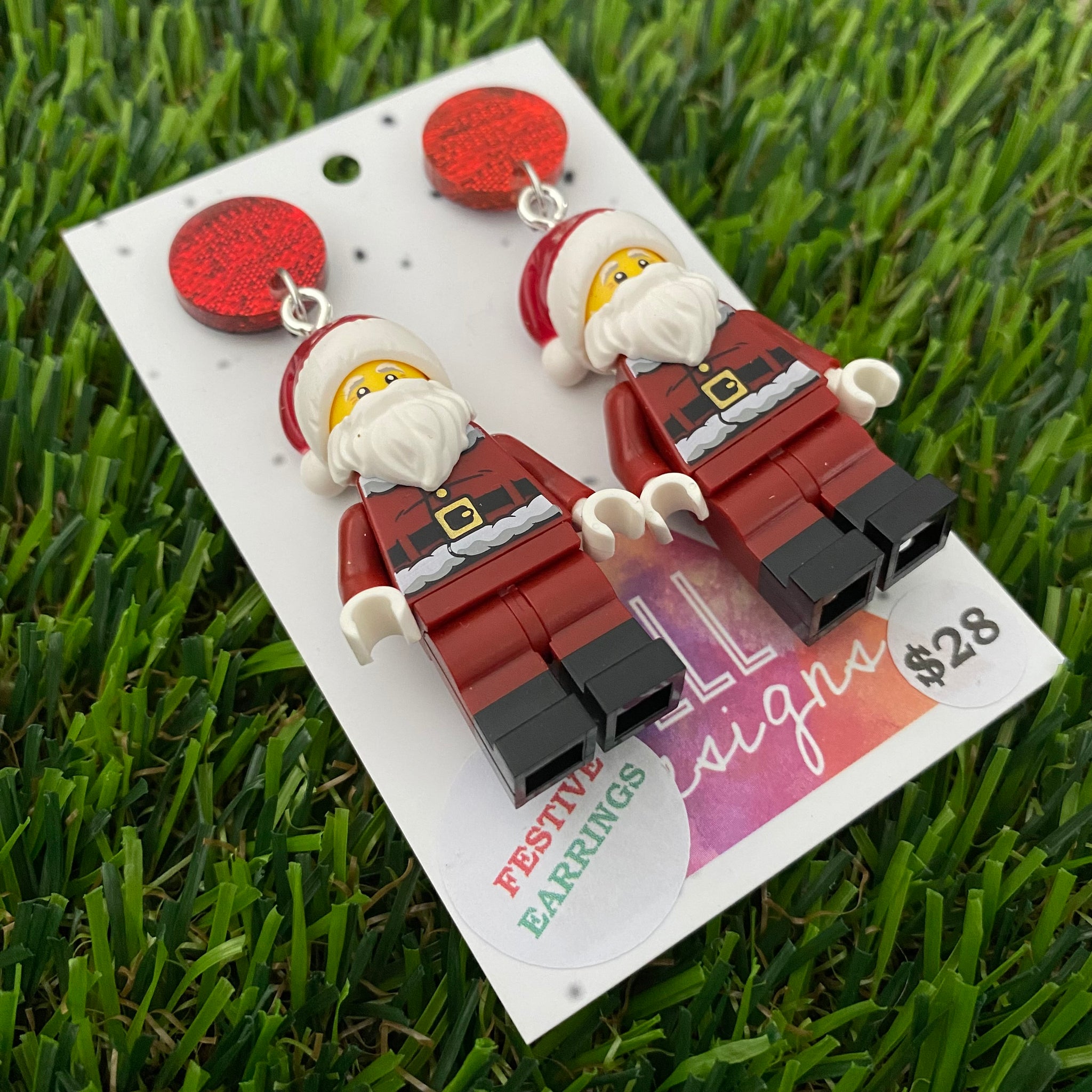 Santa Claus Christmas Brick Earrings- Maroon Santa Festive Earrings, Featuring a Glitzy Red Top