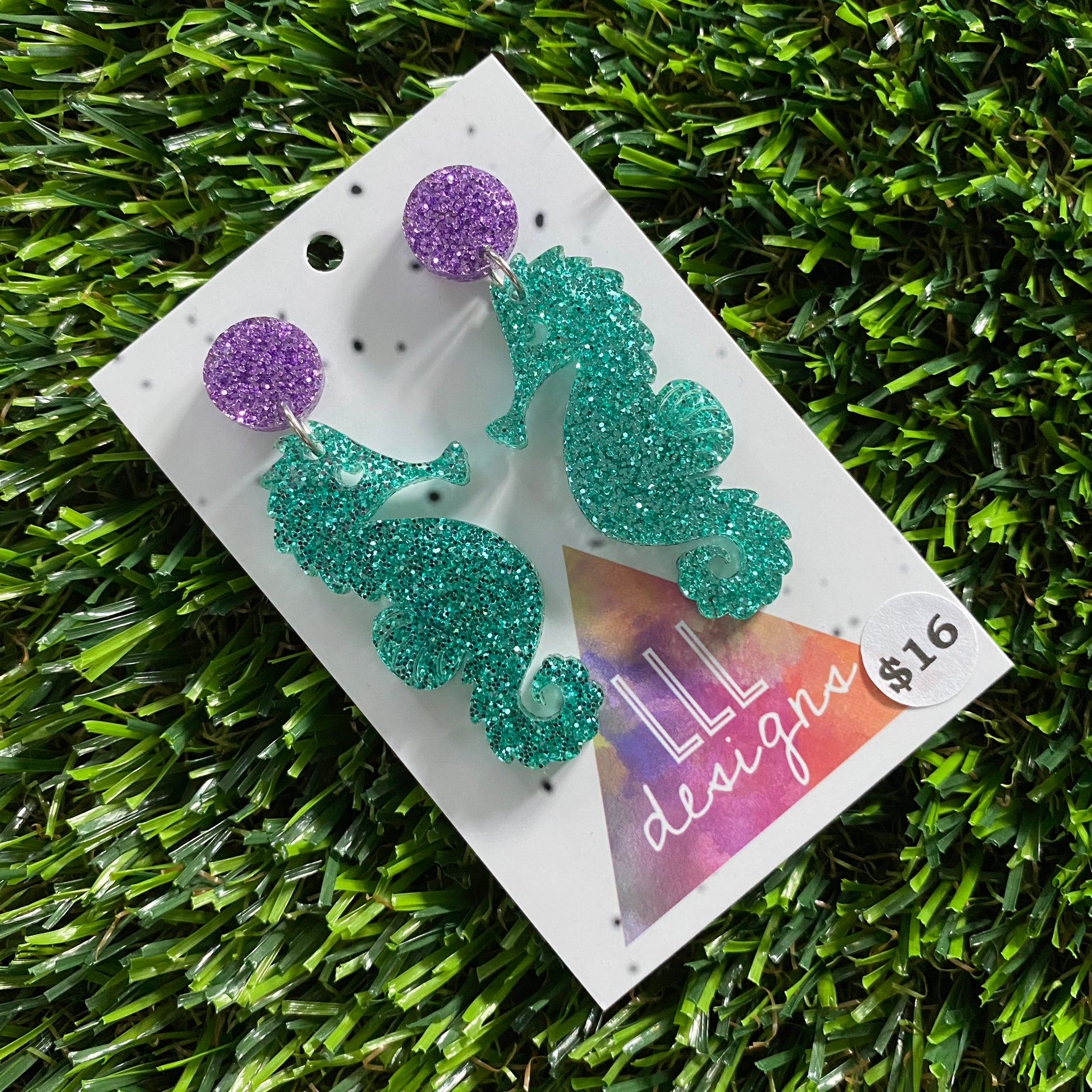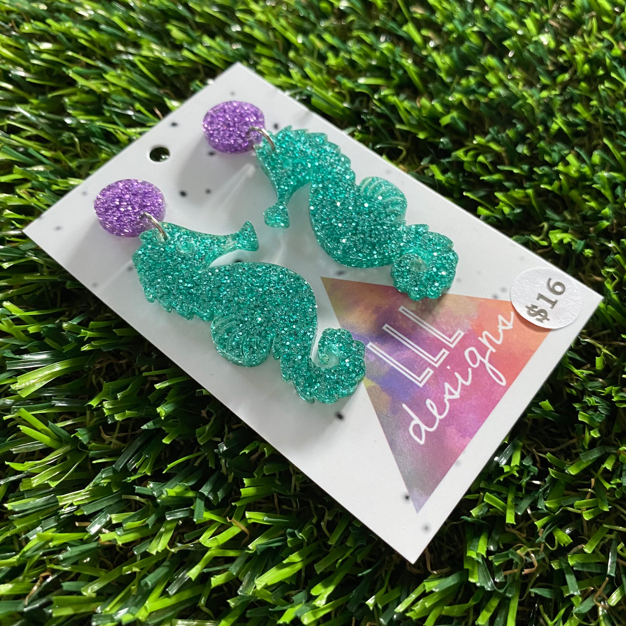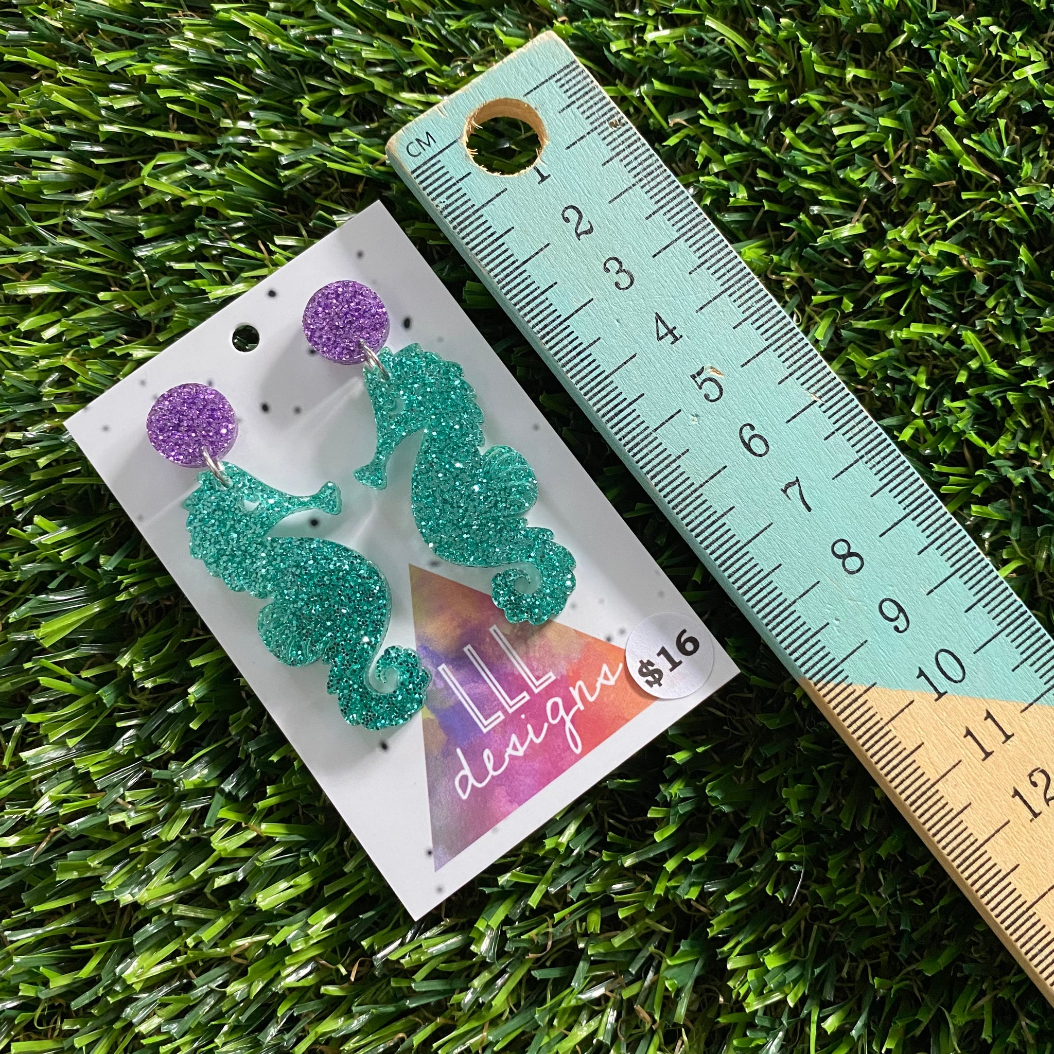 Seahorse Earrings - Glitter Aqua Medium Seahorse Dangles with Glitter Purple Top!