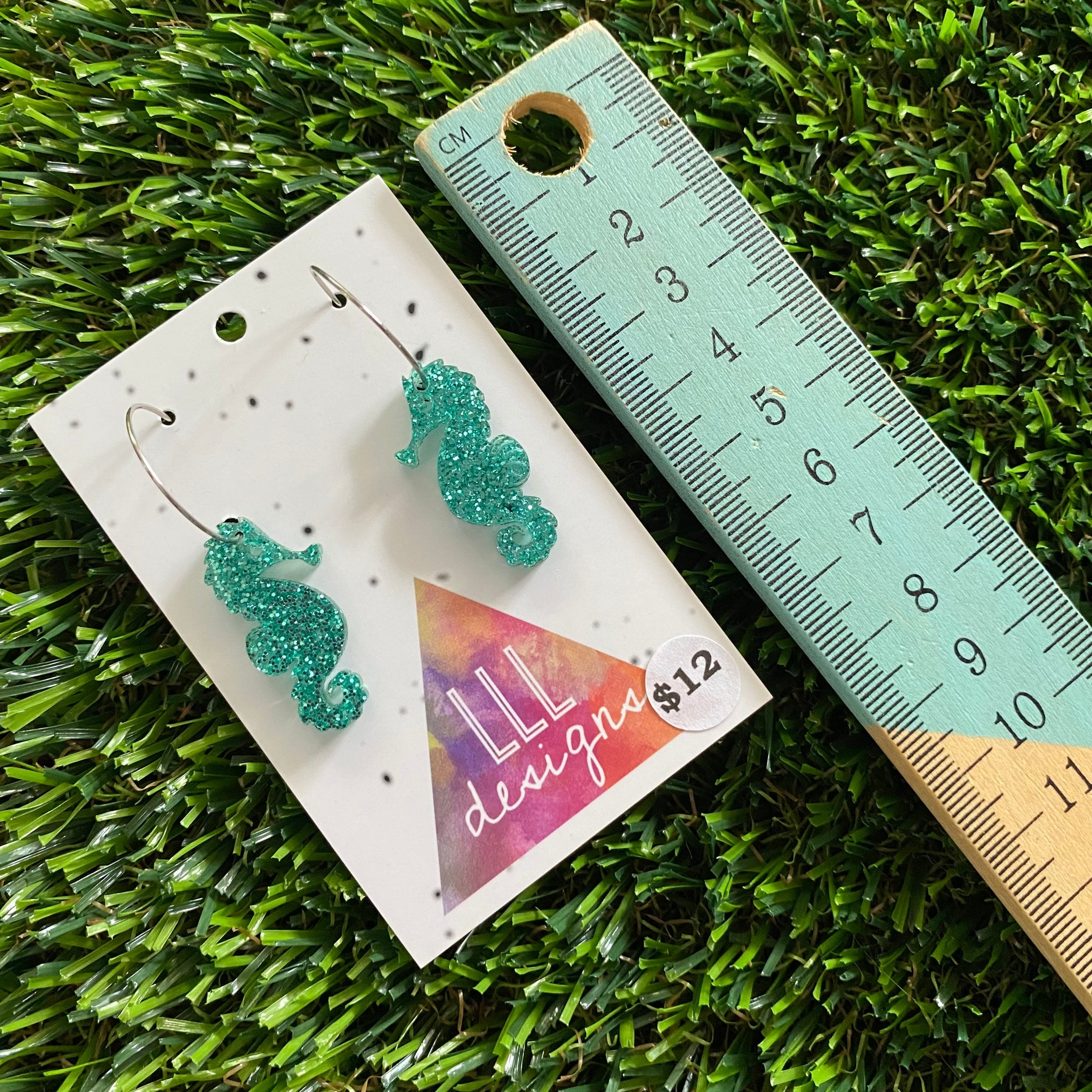 Seahorse Earrings - Glitter Aqua Small Seahorse Dangles with Silver Hoops!
