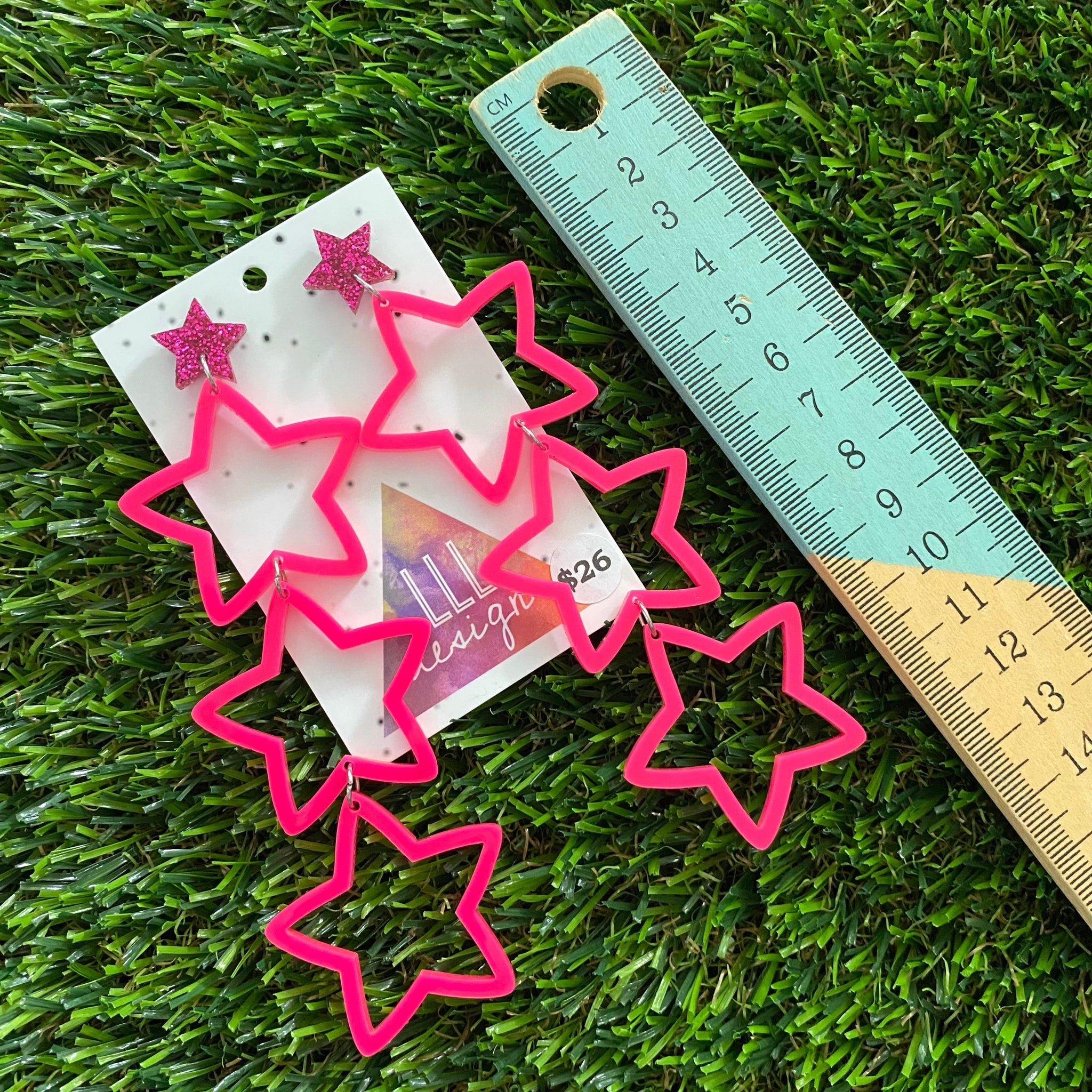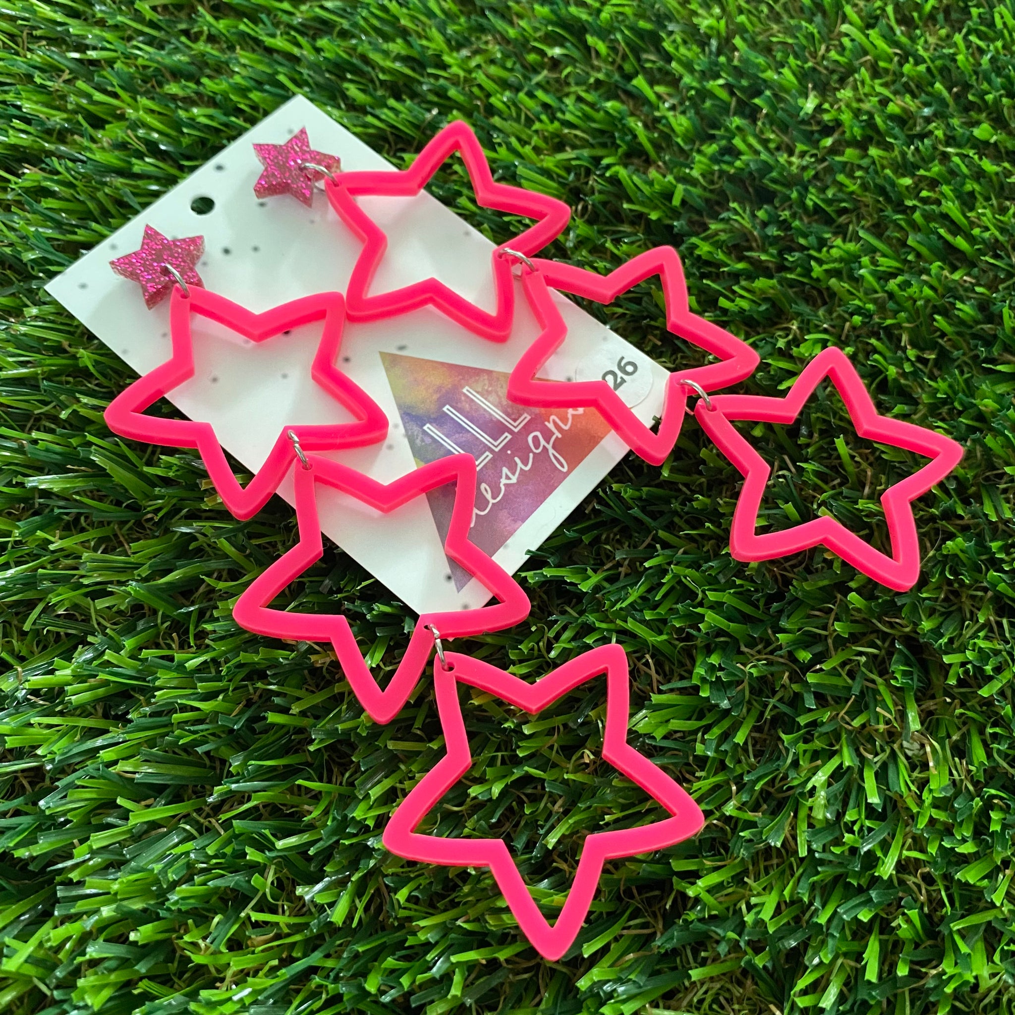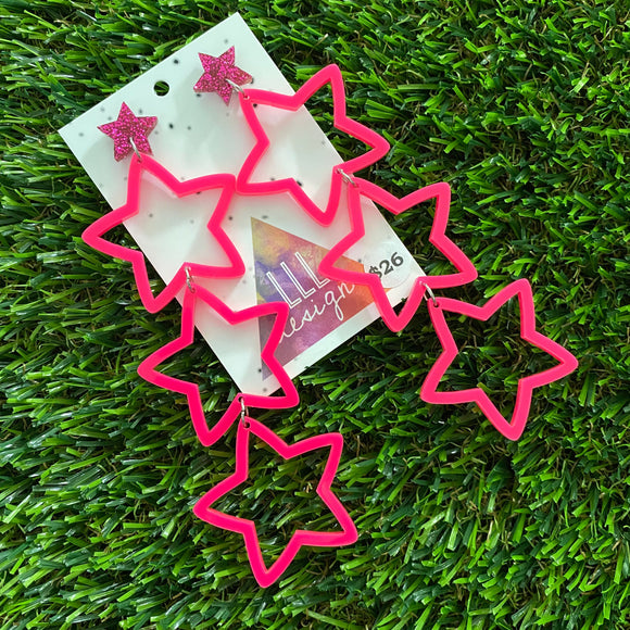 Star Earrings - Mega Star Burst Trio Stacked Pop Neon Pink Stars with Glitter Pink Star Top!