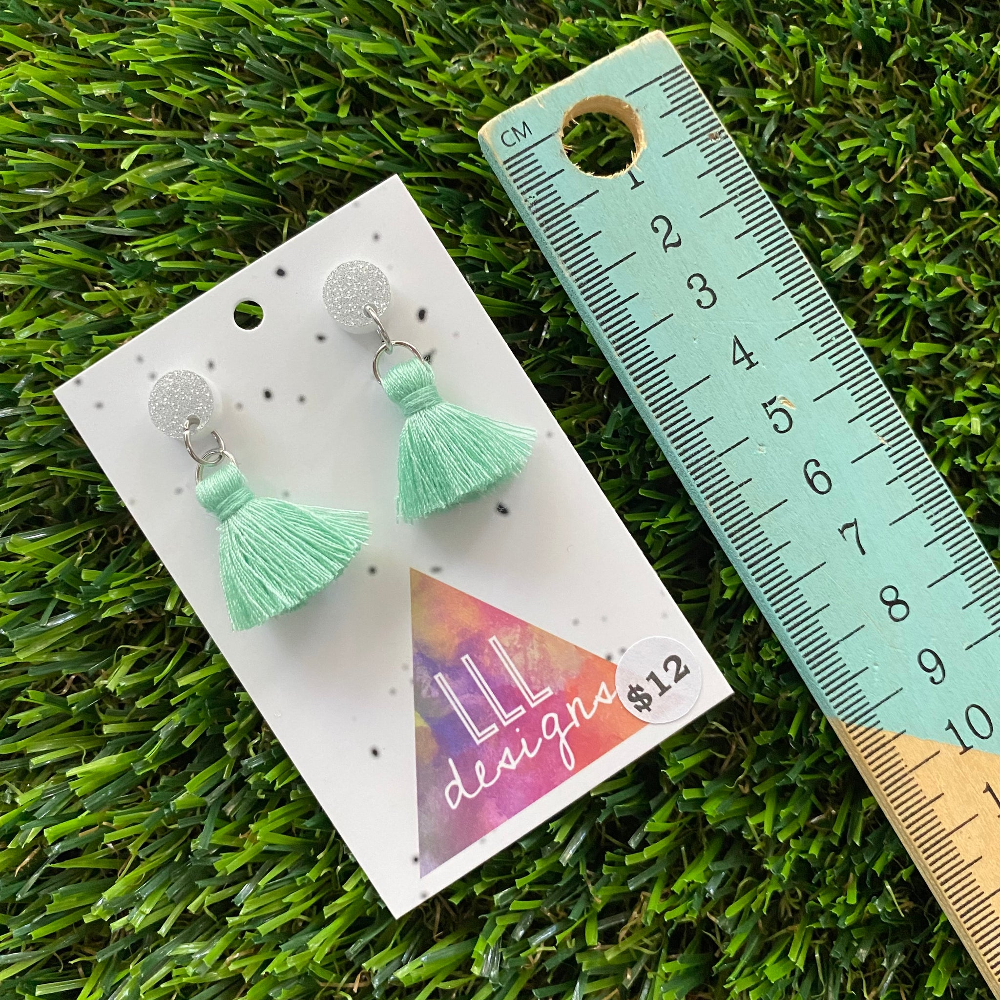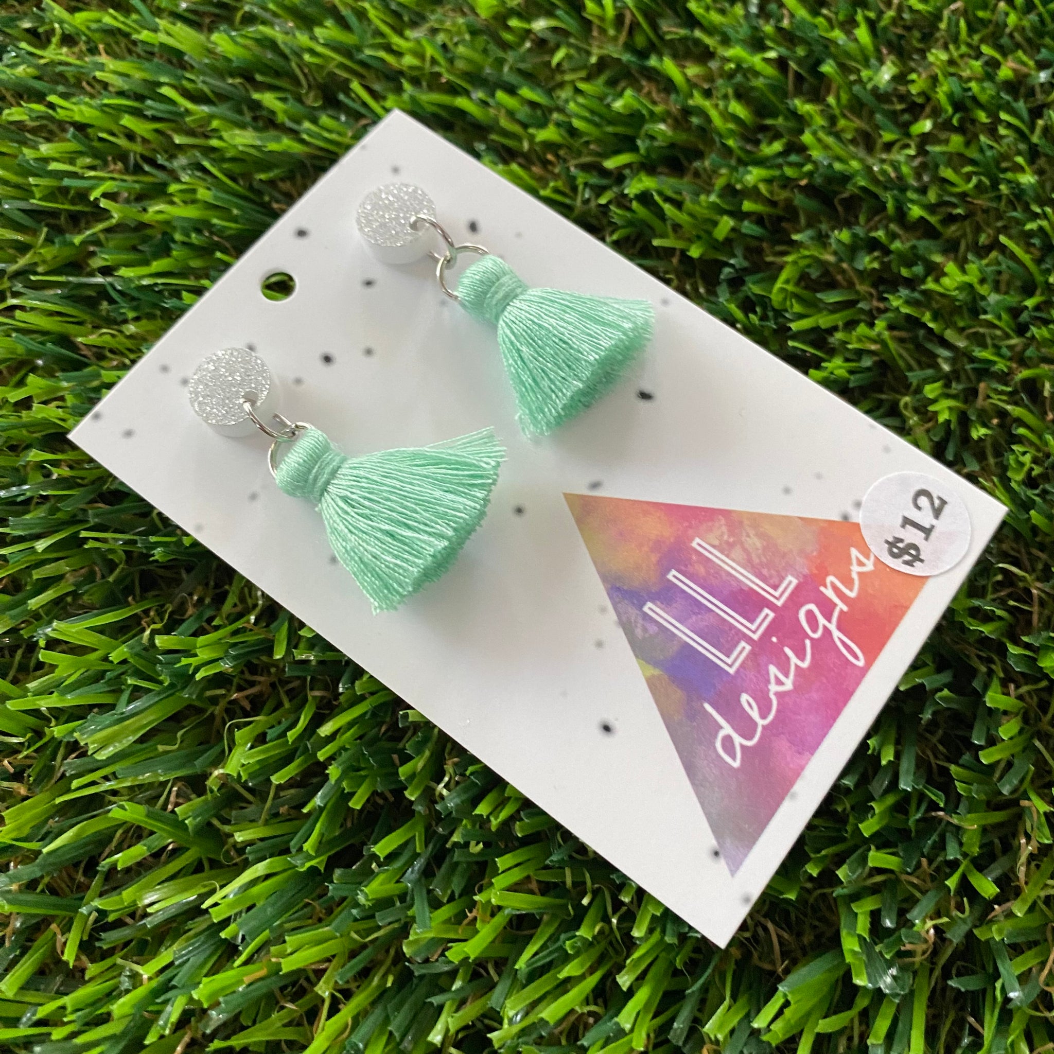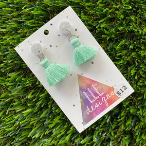 Tassel Earrings - Pastel Mint Tassels with Glitter Silver Tops!