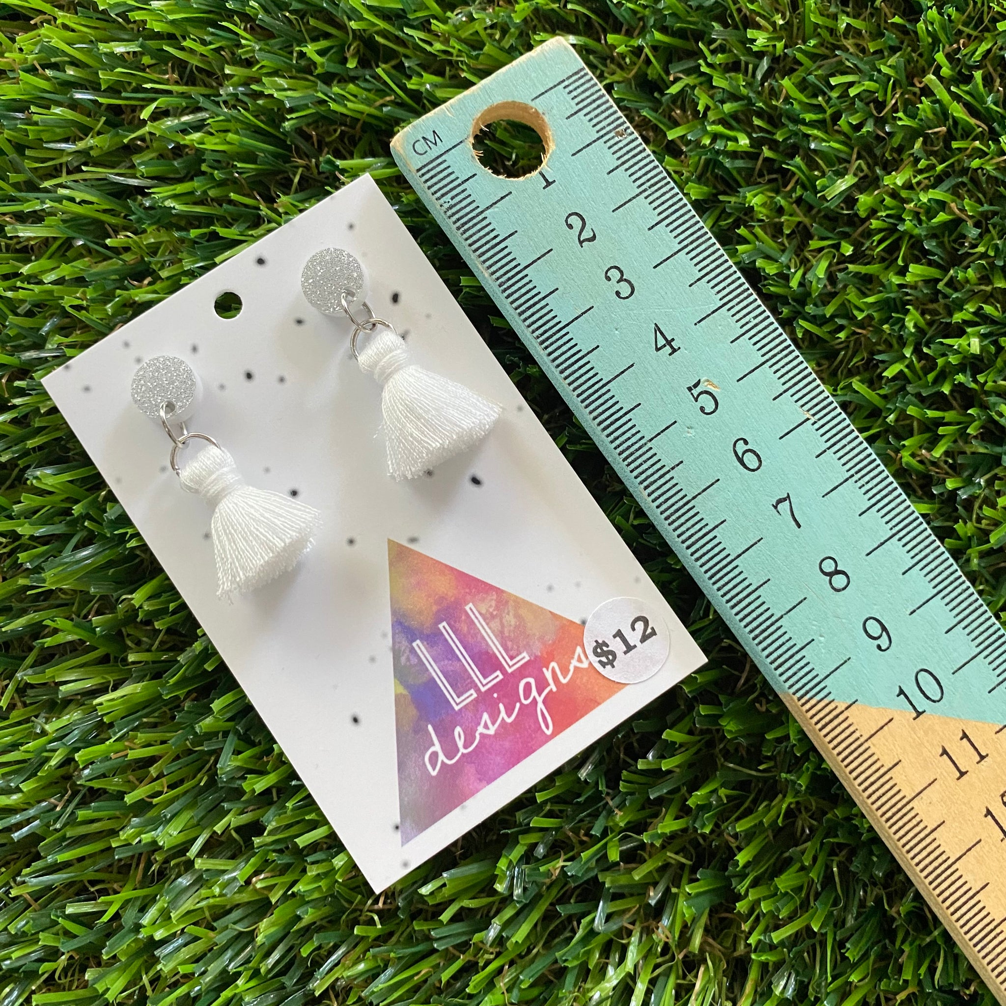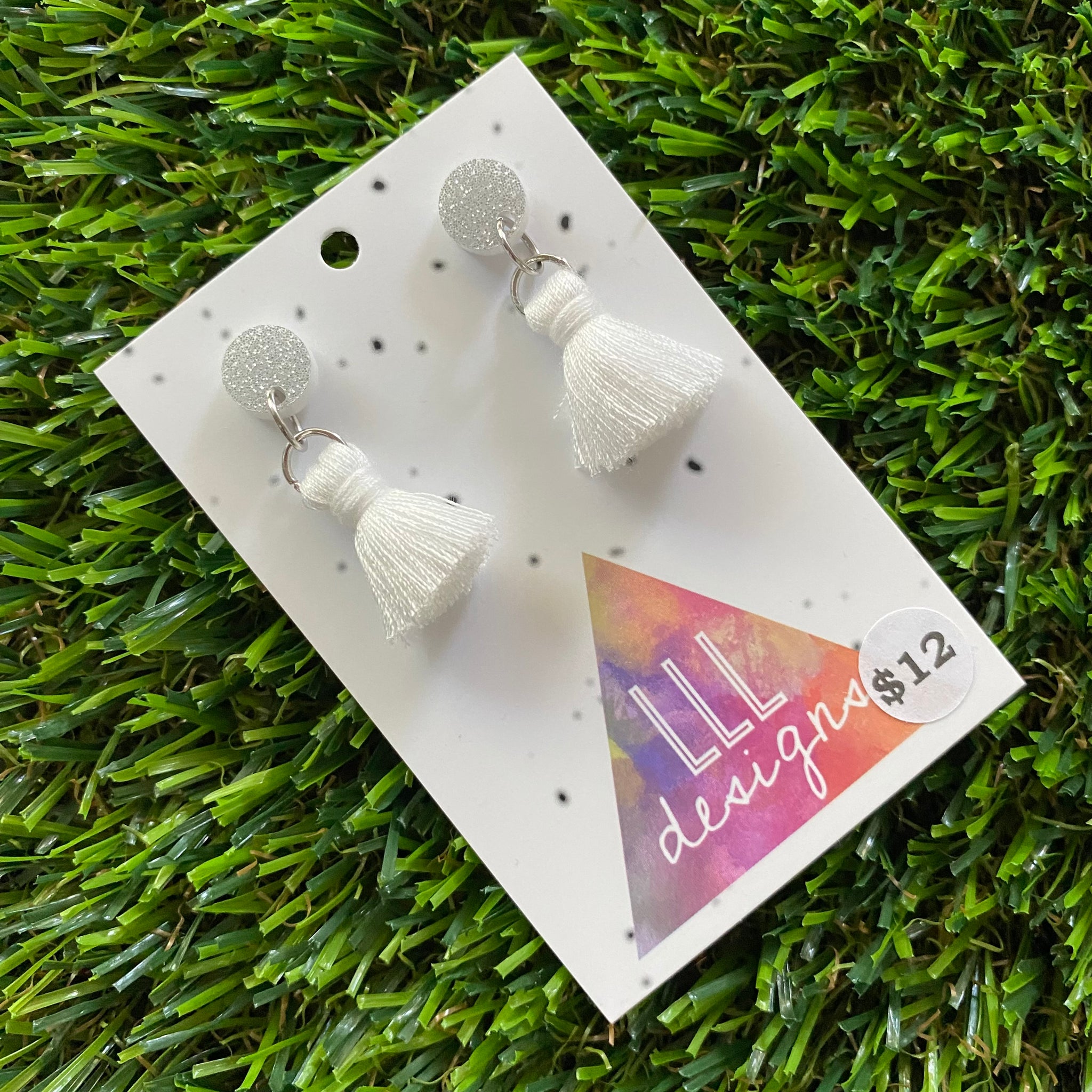 Tassel Earrings - White Tassels with Glitter Silver Tops!